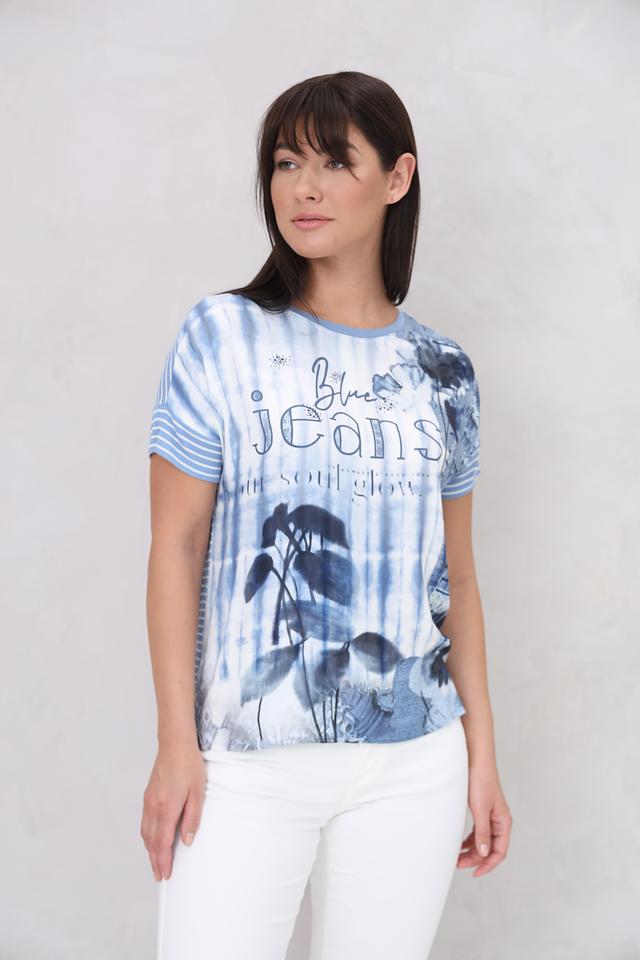 Основной цвет футболки – голубой, но она украшена оригинальным принтом в виде абстрактных цветочных мотивов и надписью "Blue Jeans". Принт выполнен в различных оттенках синего и белого, создавая эффект tie-dye. Футболка имеет короткий рукав и округлый вырез горловины.