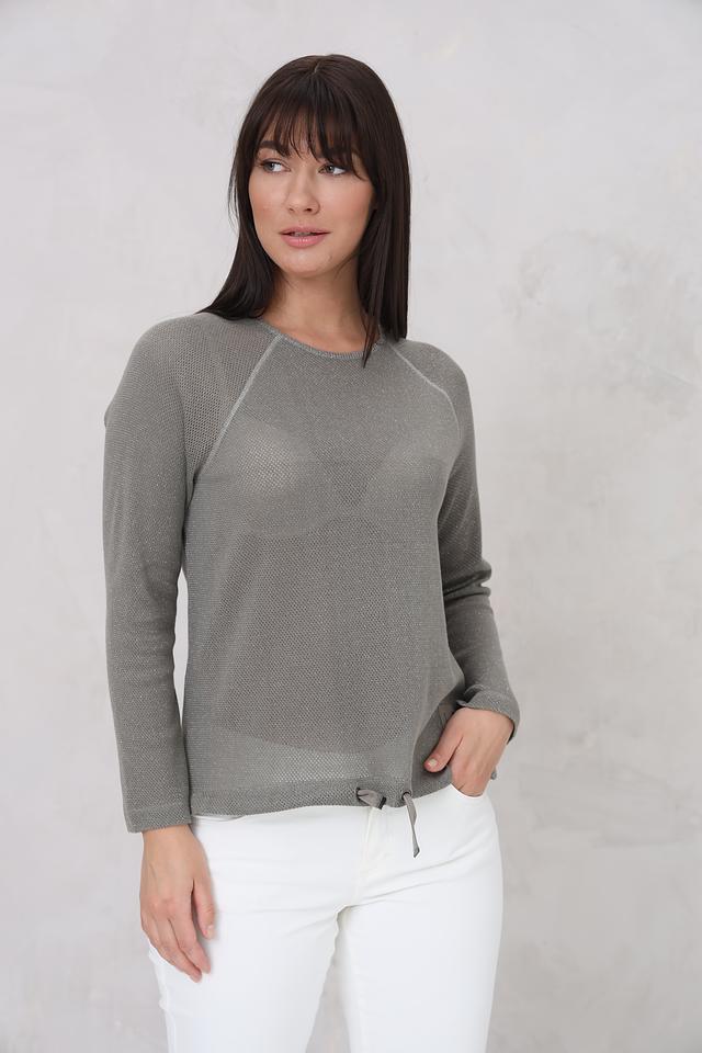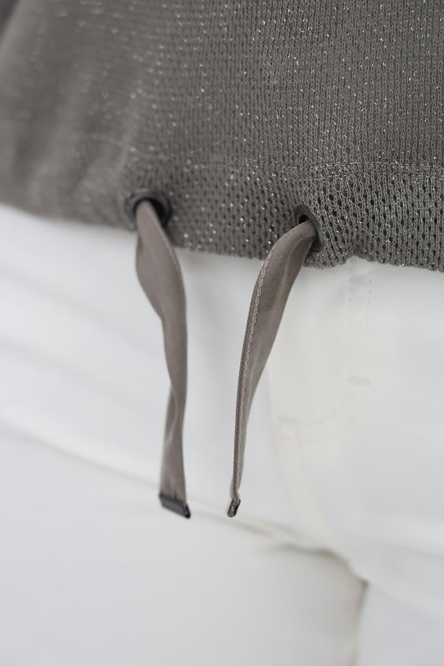 Пуловер имеет приятную текстуру, благодаря чему он выглядит интересно и необычно. V-образный вырез и завязки по бокам придают модели оригинальность и позволяют регулировать силуэт. Отделка на плечах добавляет спортивный акцент.