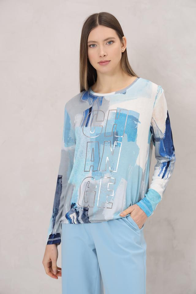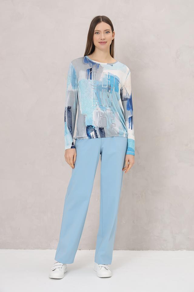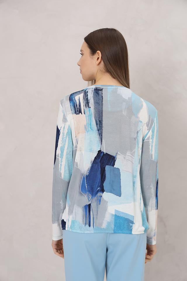 Пуловер имеет свободный крой и длинные рукава. Главная особенность модели – эффектный принт "Change Angel", выполненный в сочетании голубых, серых и белых оттенков, напоминающий мазки кисти художника.
