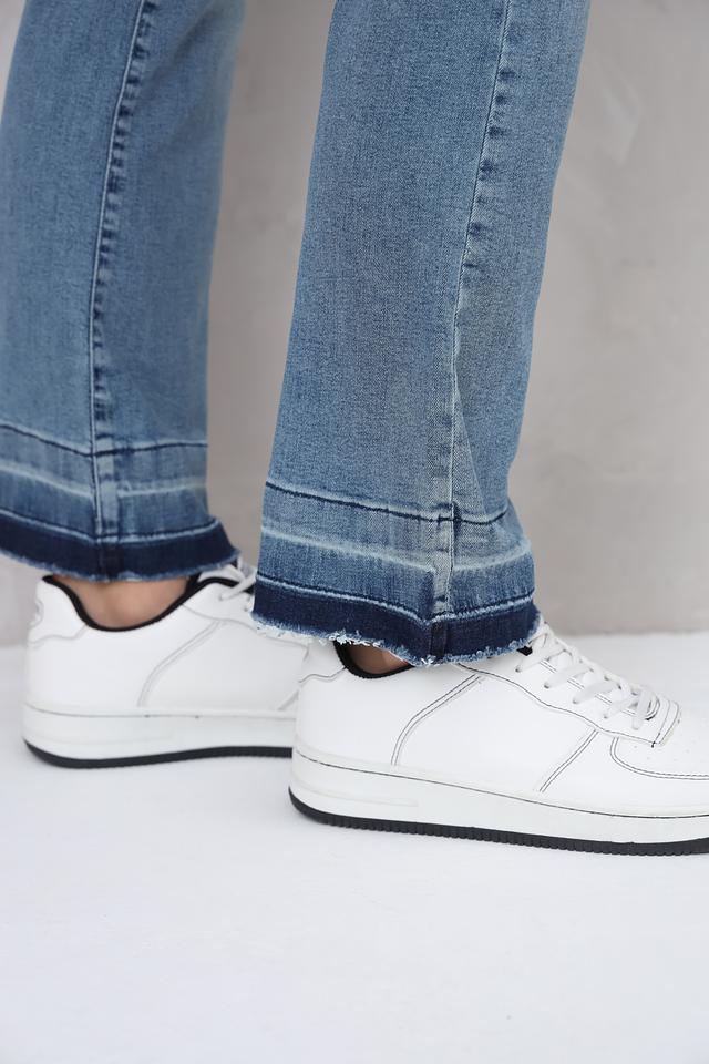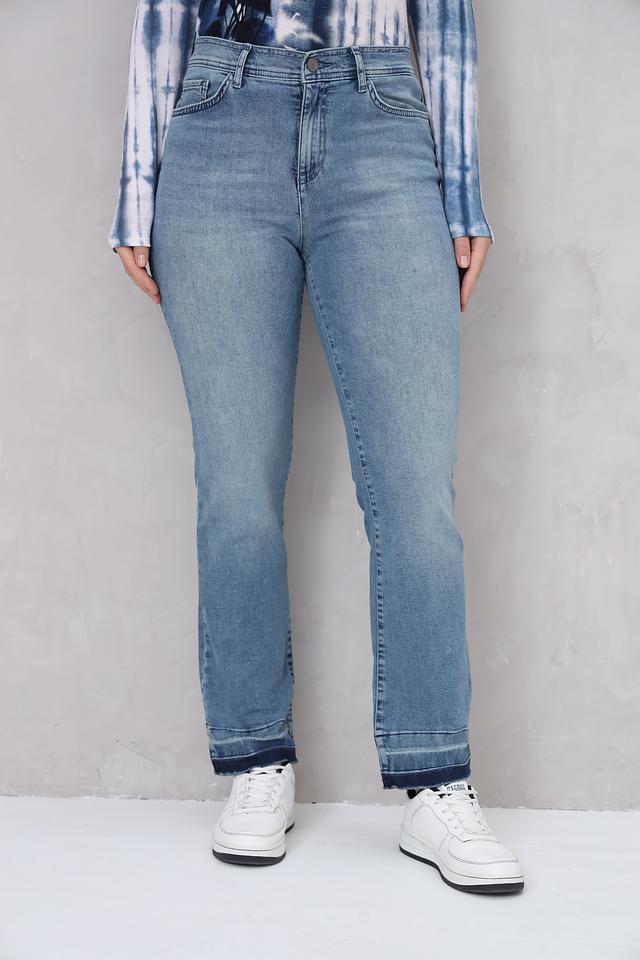 Джинсы имеют прямой крой, который обеспечивает комфортную посадку по фигуре. Особенностью модели является необработанный край штанин, придающий образу непринужденность и современный вид. Высокая посадка подчеркивает талию и визуально удлиняет ноги.