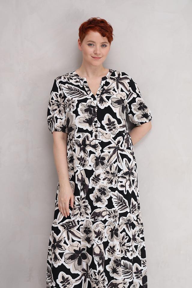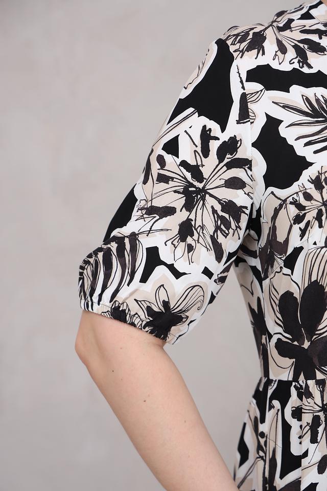 Это платье от Lecomte станет прекрасным дополнением к вашему гардеробу. Выполнено в чёрно-белой цветовой гамме с эффектным цветочным принтом, которое придает образу свежесть и женственность.