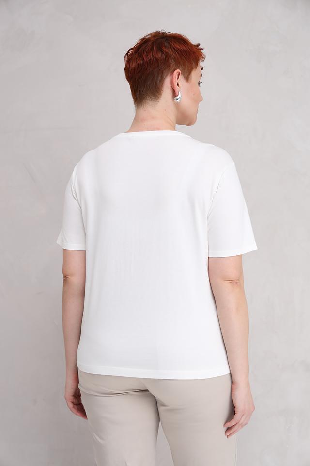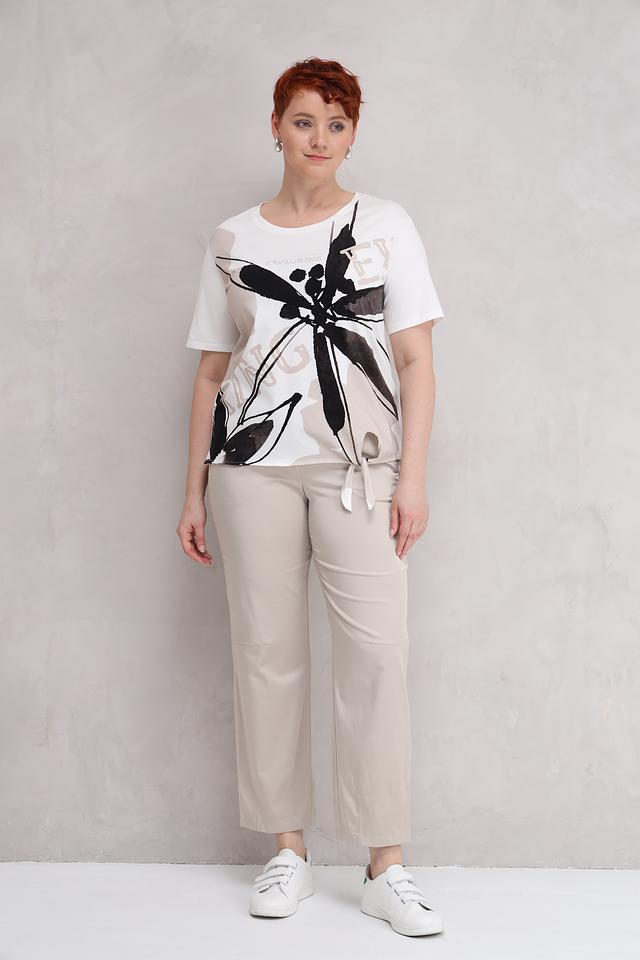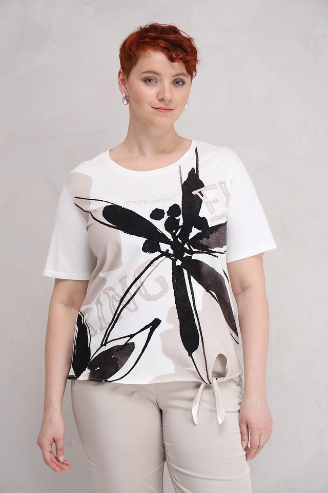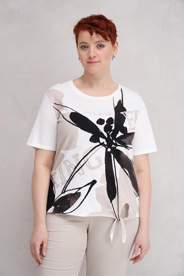 Основной цвет футболки – белый, украшен эффектным принтом в виде абстрактных цветочных мотивов, выполненных в чёрно-серых тонах. Принт добавляет образу оригинальности и динамики.