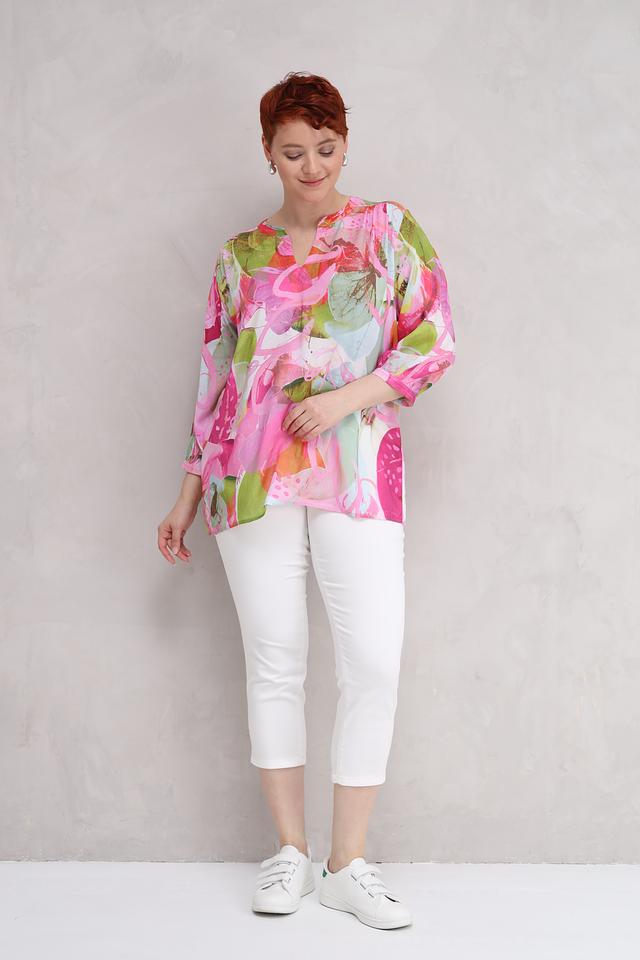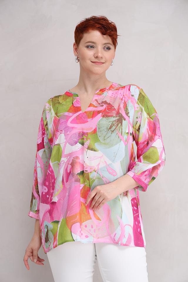 Яркий цветочный принт делает эту блузу уникальной и привлекательной. Она идеально подходит для создания как повседневных, так и праздничных образов. Блузу можно сочетать с брюками, юбками или джинсами.