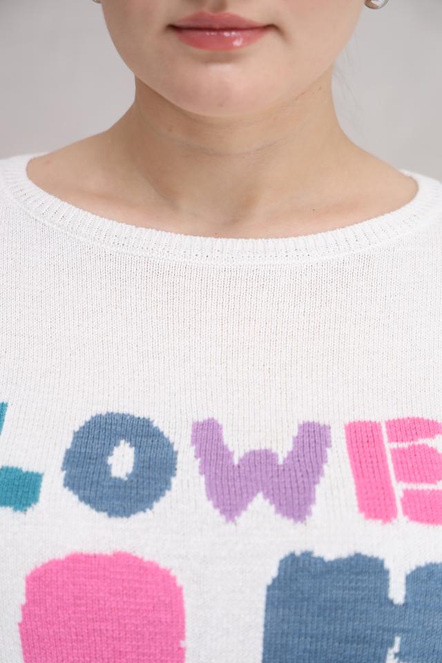 Этот пуловер от Lecomte – отличный выбор для создания непринужденного и яркого образа. Он выполнен в белом цвете и украшен крупной, многоцветной надписью "Flower Up", которая придает ему оригинальность и позитивный настрой.