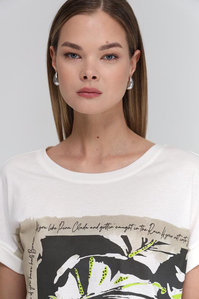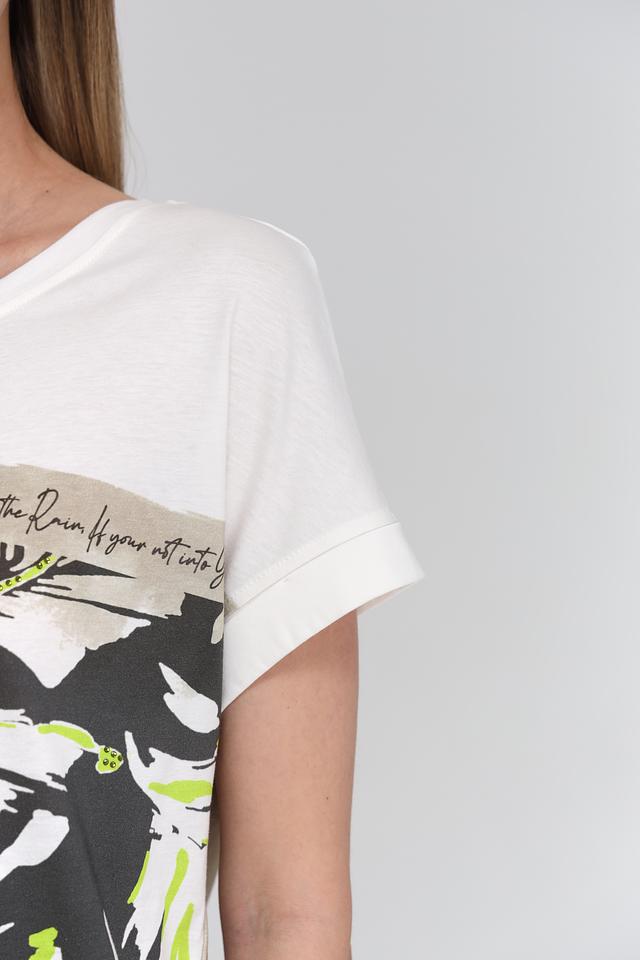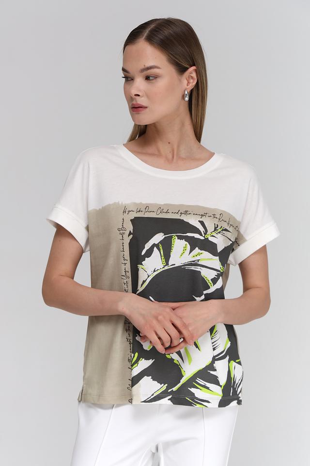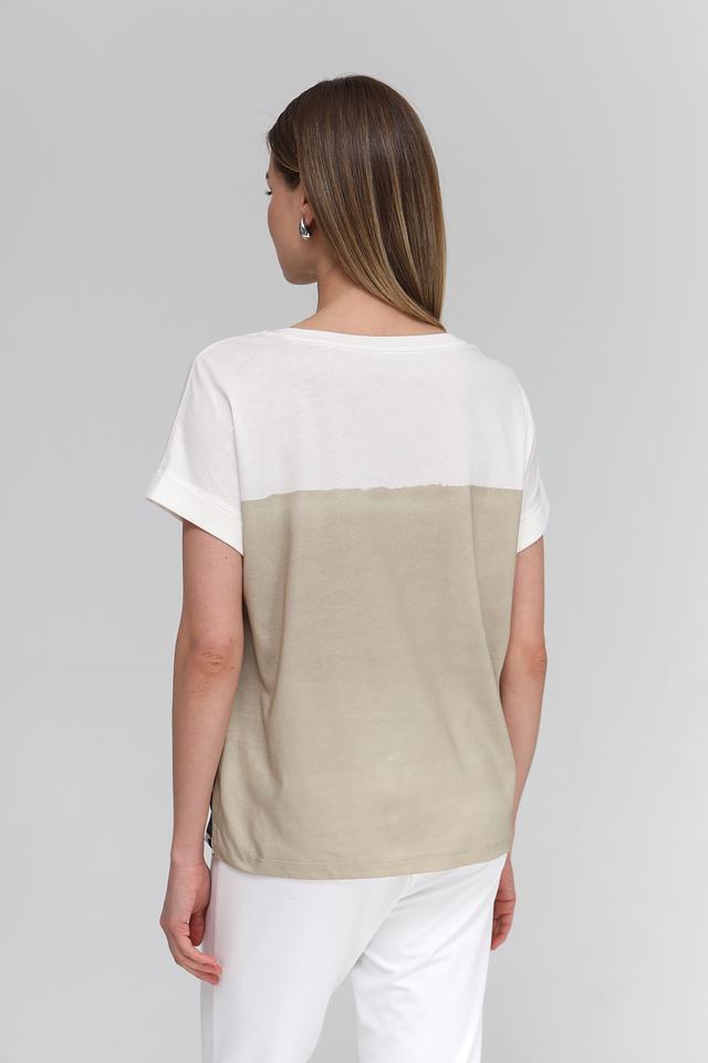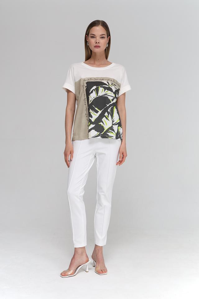 Фасон футболки – свободный, с короткими рукавами и округлым вырезом горловины. Такая модель отлично подойдет для создания повседневных образов. Футболка идеально сочетается с белыми брюками, джинсами или шортами.