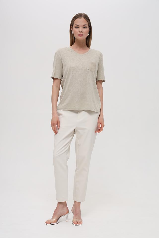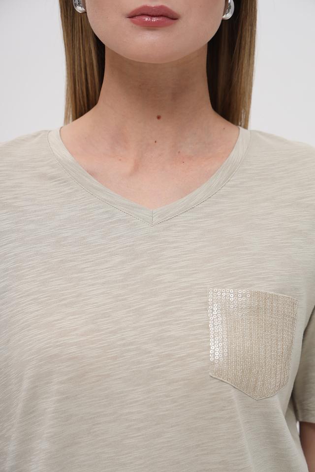 Модель имеет классический V-образный вырез, короткие рукава и свободный крой, обеспечивающий комфорт в носке. На передней части блузы расположен накладной карман, декорированный вышивкой бисером, что придает ей изысканности.