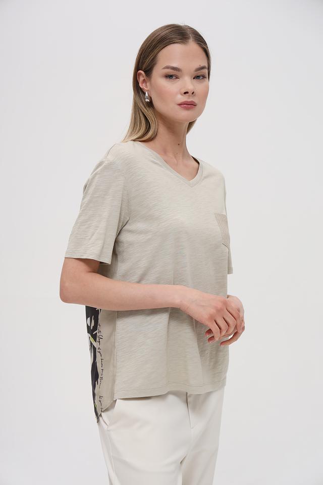 Бежевая блуза Lecomte из хлопка и модала с V-образным вырезом и накладным карманом. Эта модель отличается свободным кроем и оригинальным принтом на спине, что делает ее стильным и комфортным выбором. Состав: хлопок 50%, модал 50%