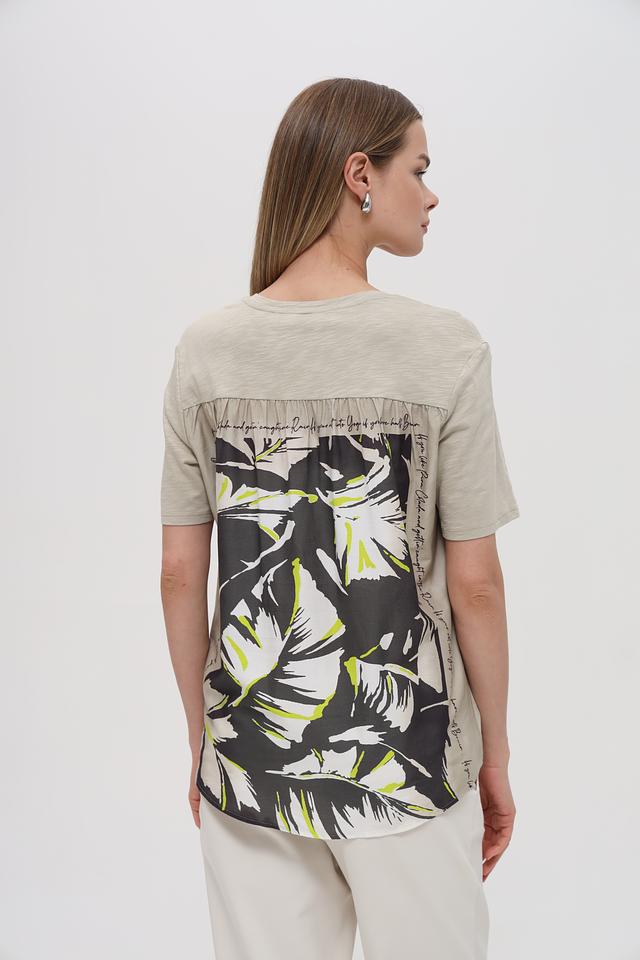 Особенностью данной модели является оригинальный принт с изображением листьев и надписями на спине, выполненный в графитовых и салатовых тонах. Эта блуза станет отличным дополнением к вашему гардеробу и подойдет для создания как повседневных, так и более нарядных образов.