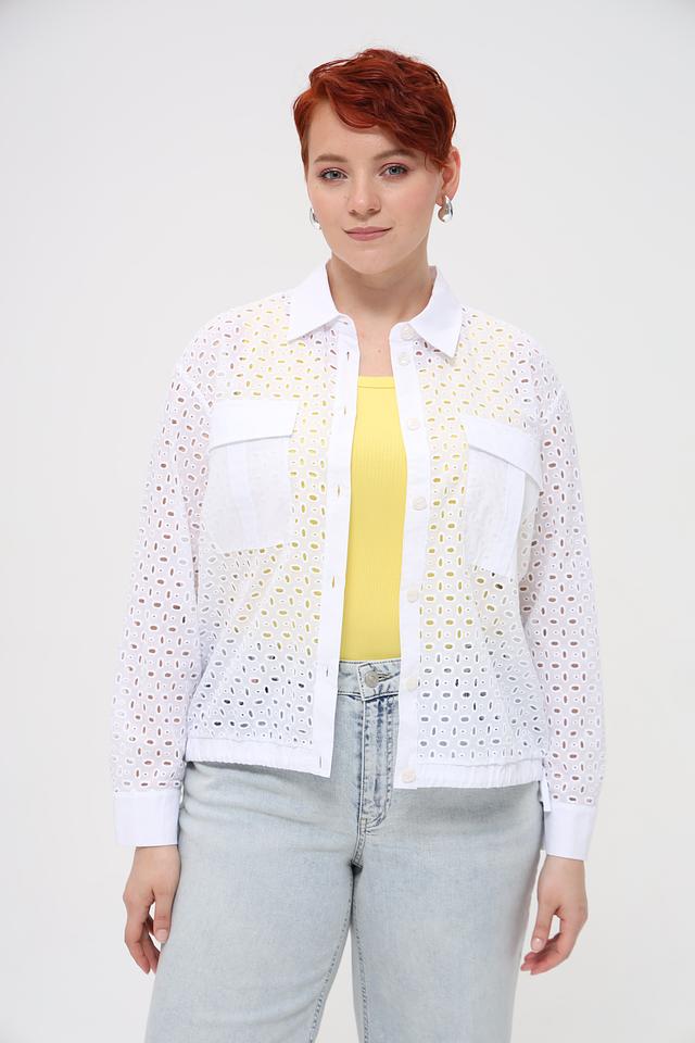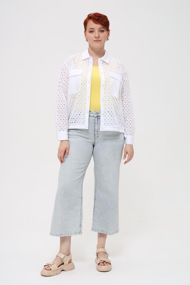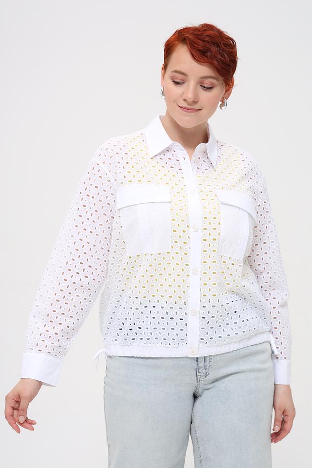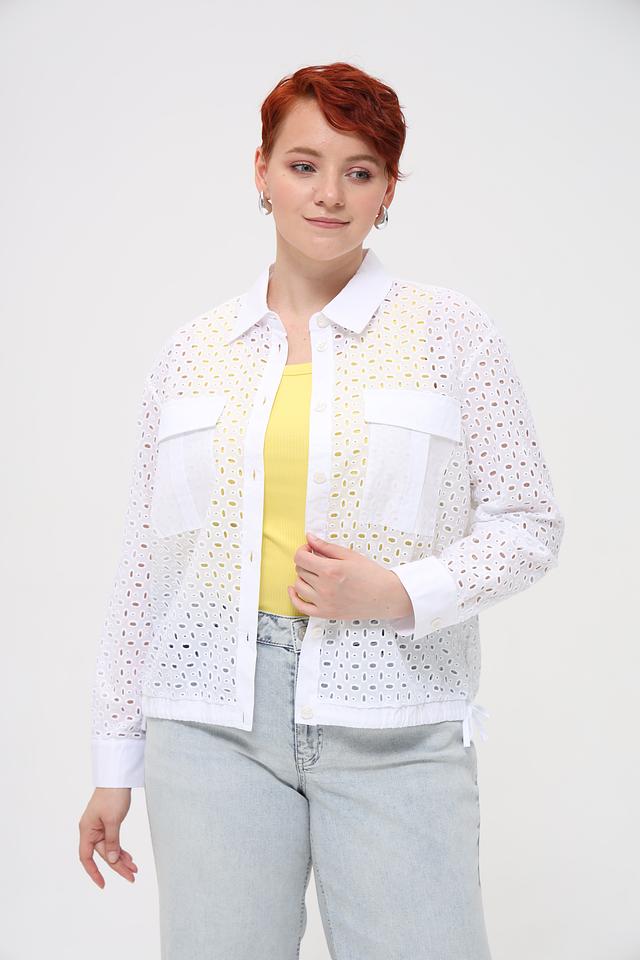 Особенностью данной модели является ажурная вышивка, которая придает ей легкость и изысканность. Блуза имеет классический крой с воротником и застежкой на пуговицы. Накладные карманы добавляют функциональности и стиля.