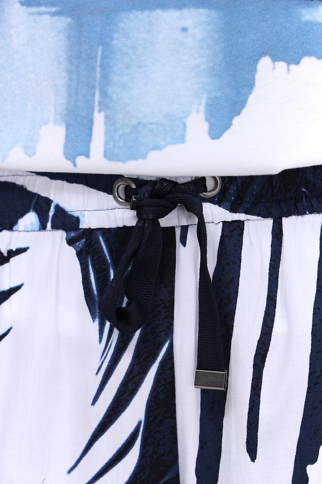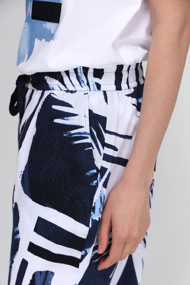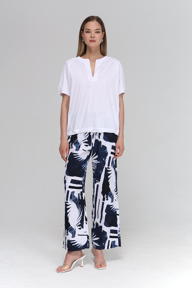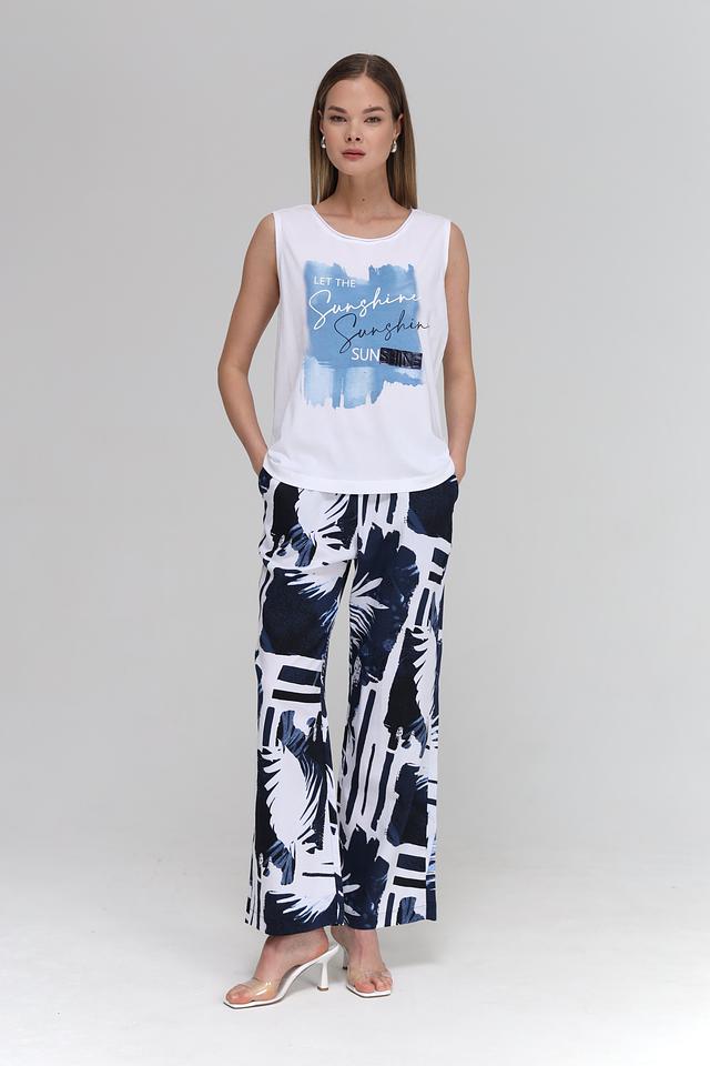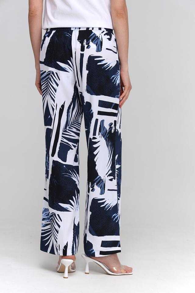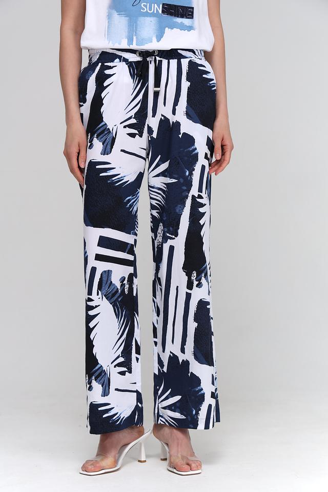 Брюки имеют прямой крой и широкие штанины, что делает их удобными и универсальными. Оригинальный принт с изображением тропических листьев в сине-белой гамме придает им неповторимый стиль.