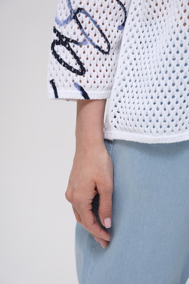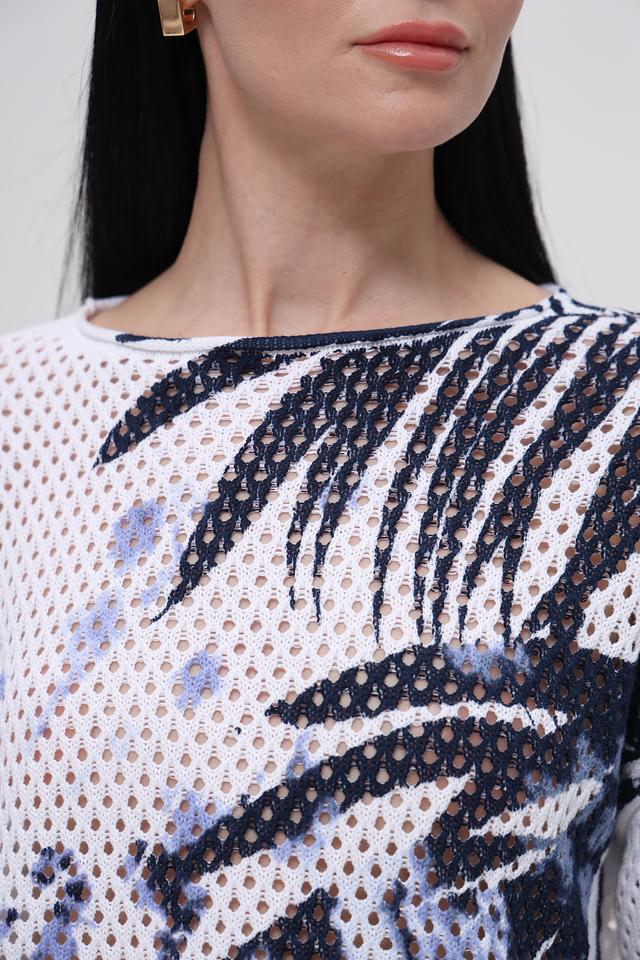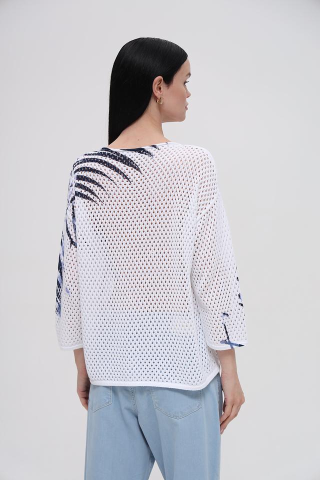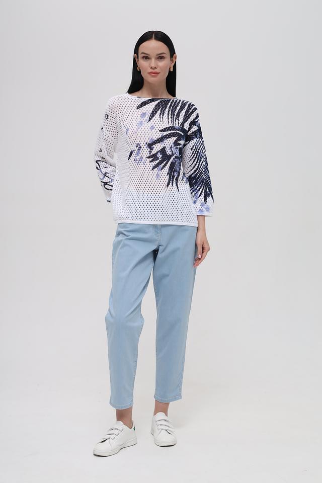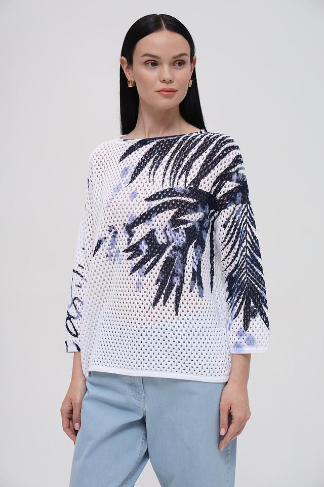 Основной цвет пуловера – белый, а в качестве декоративного элемента выступает принт в виде листьев, выполненный в синих и голубых тонах. Ажурная вязка придает изделию легкость и воздушность.