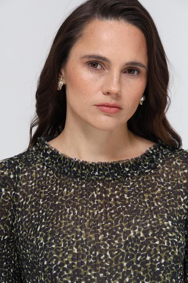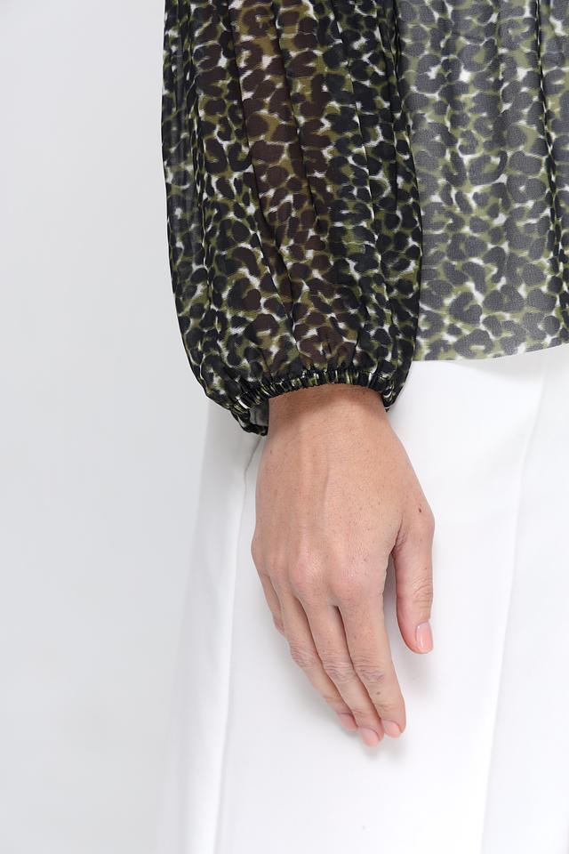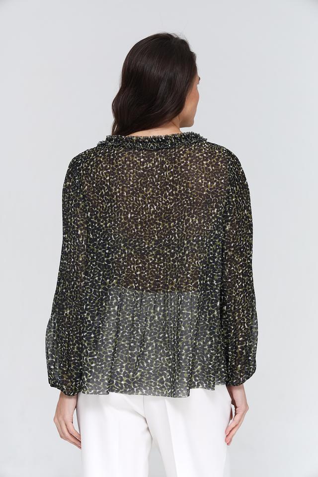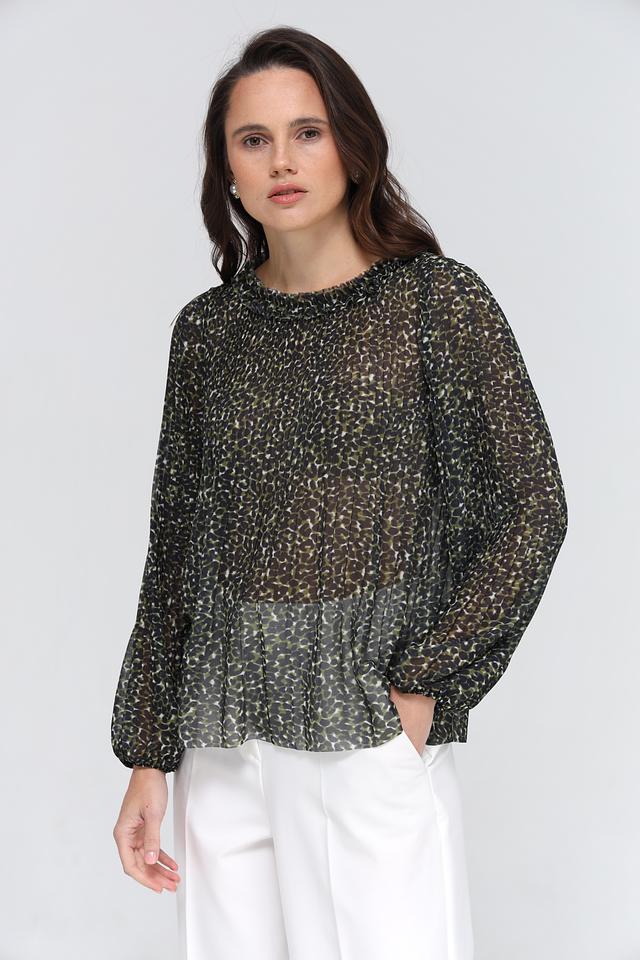 Легкая блуза Lecomte зеленого цвета с оригинальным принтом. Изготовлена из 100% полиэстера, что обеспечивает комфорт и простоту в уходе. Идеальный выбор для создания стильного и женственного образа. Состав: полиэстер 100%