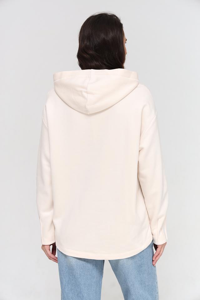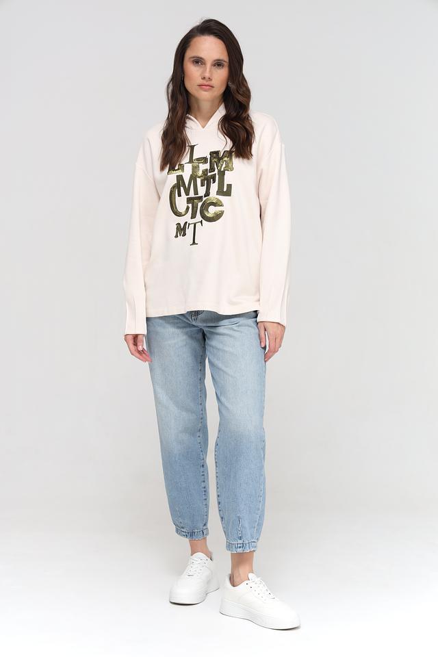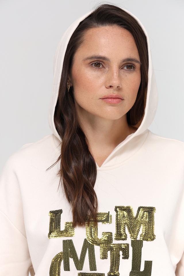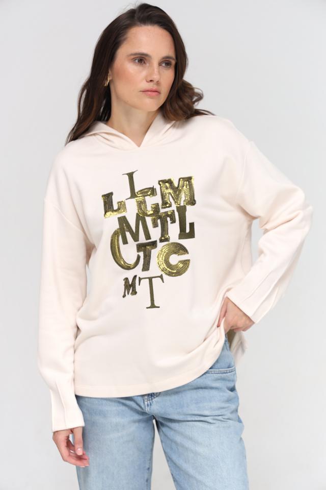 Бежевый пуловер Lecomte с капюшоном украшен эффектным логотипом из пайеток. Модель свободного кроя выполнена из мягкого и приятного к телу модала с добавлением хлопка. Состав: модал 80%, хлопок 20%