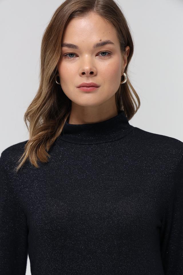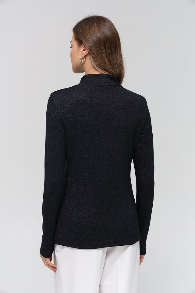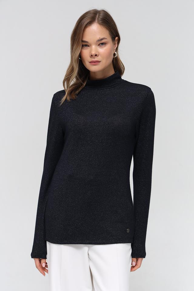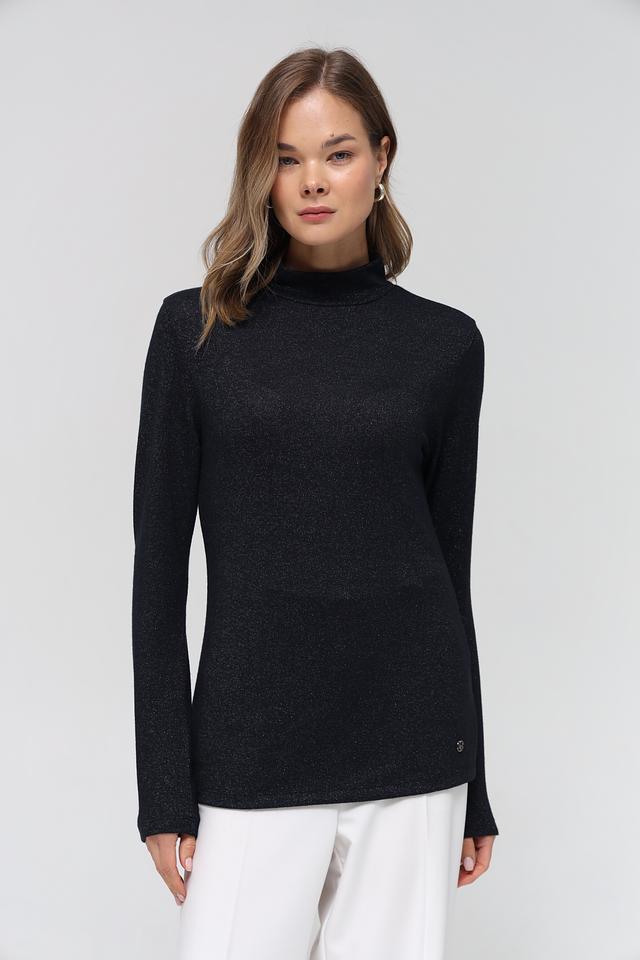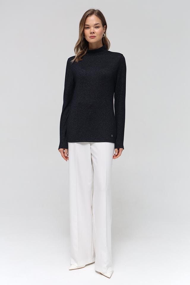 Пуловер имеет облегающий силуэт и высокую горловину, что придает ему изысканность. Небольшой декоративный элемент с логотипом бренда расположен на рукаве. Состав ткани включает 70% вискозы, 25% металлической нити и 5% эластана, обеспечивая комфорт в носке и сохранение формы.