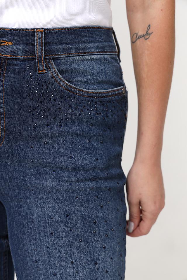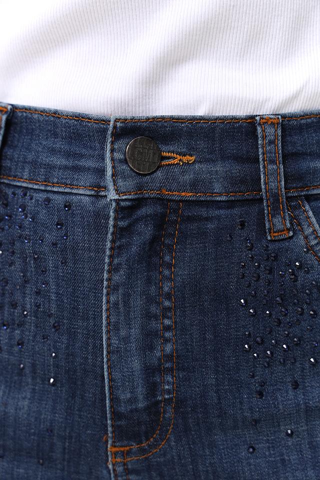 Джинсы имеют классический синий цвет и высокую посадку, подчеркивающую талию. Оригинальным акцентом является декор из страз, расположенный на передней части брюк, что придает им изысканный вид.