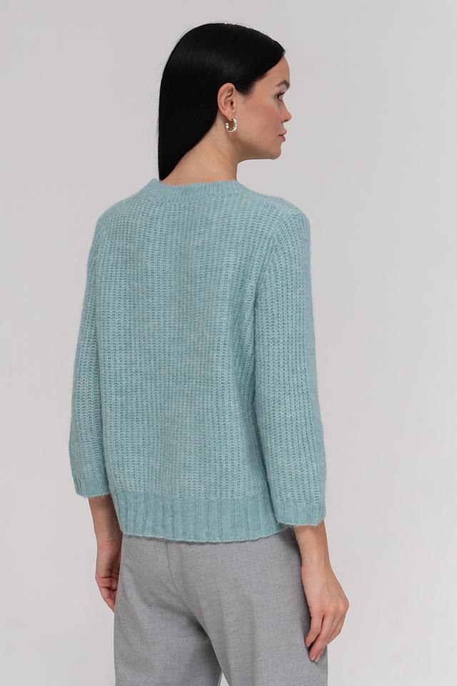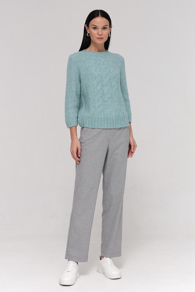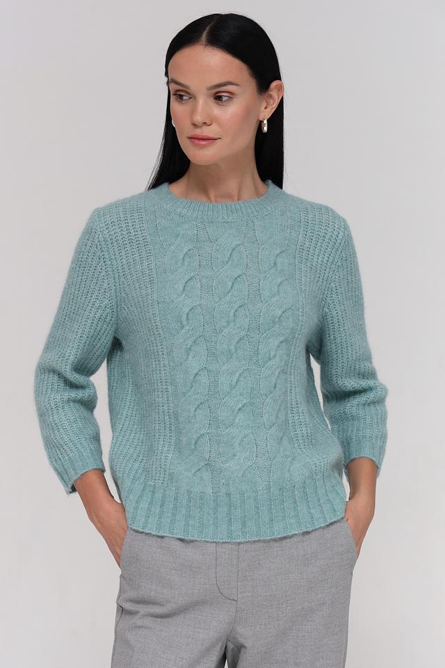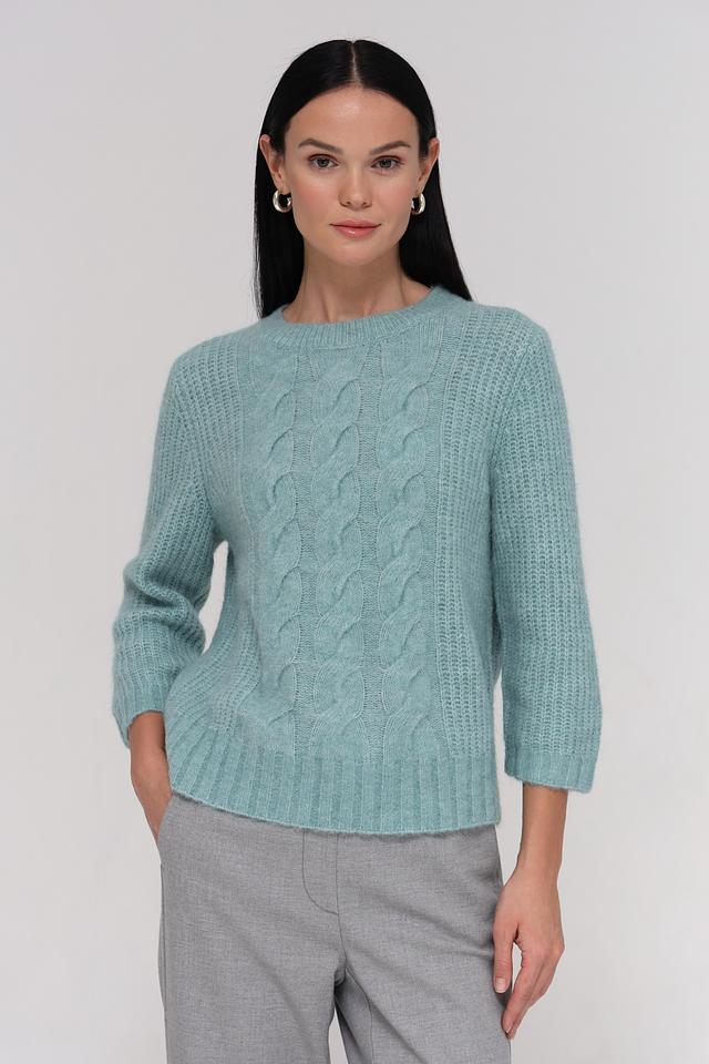 Пуловер имеет приятный мятный цвет и украшен рельефным узором из кос, который придает ему оригинальность и текстуру. Круглый вырез горловины и рукава 3/4 делают его универсальным для различных стилей и образов.