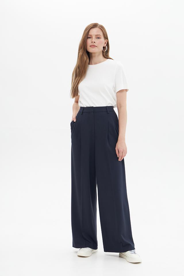 Брюки имеют высокую посадку и широкие штанины, создающие элегантный и современный силуэт. Складки на талии добавляют объема и подчеркивают женственность. Застежка на молнию и пуговицу обеспечивает надежную фиксацию.