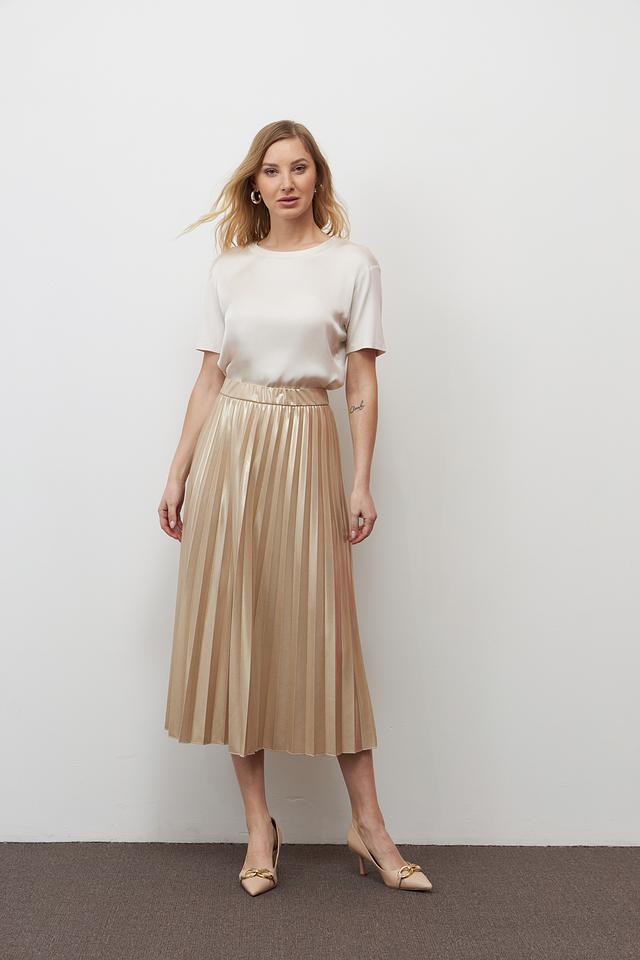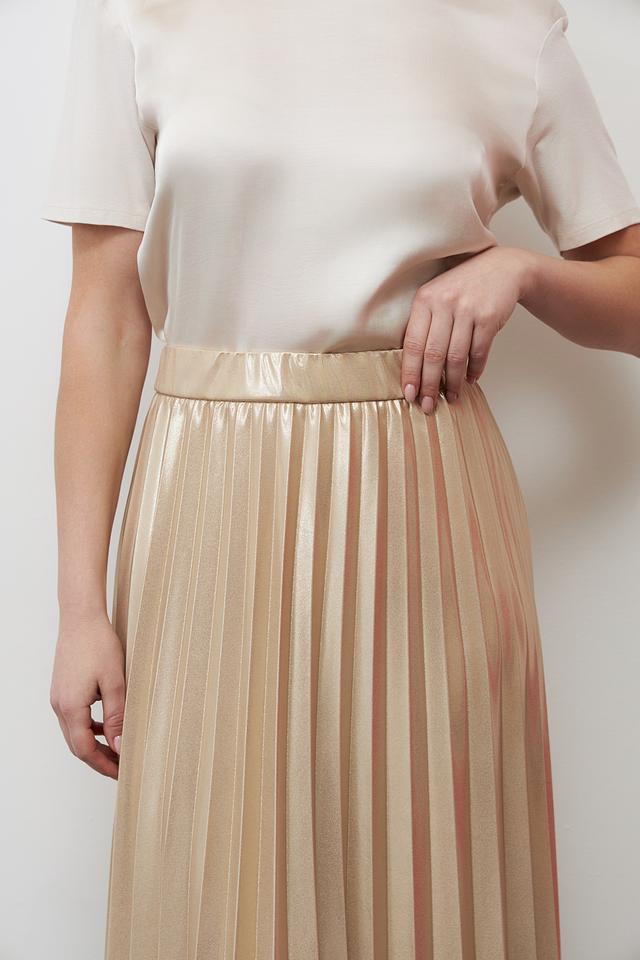 Модель имеет классическую плиссированную фактуру и длину миди, что делает ее универсальной для различных случаев. Удобная эластичная талия обеспечивает комфортную посадку по фигуре.