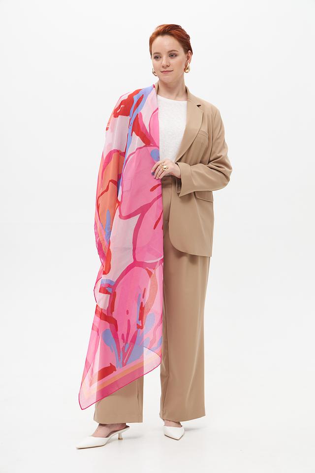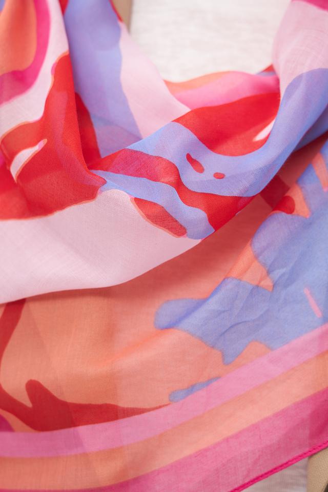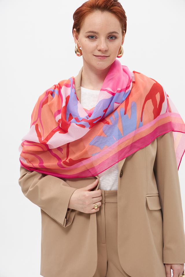 Дизайн шарфа представлен абстрактным рисунком, сочетающим в себе несколько оттенков розового, красного, сиреневого и персикового цветов. Такое сочетание делает шарф универсальным и подходящим для различных стилей одежды.