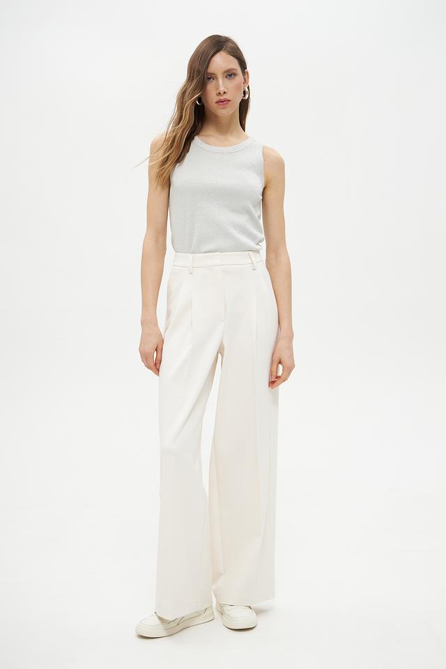Топ имеет классический крой без рукавов и округлым вырезом горловины, что делает его универсальным для создания различных образов. Его можно сочетать с джинсами, брюками или юбками, создавая как повседневные, так и более элегантные комплекты.