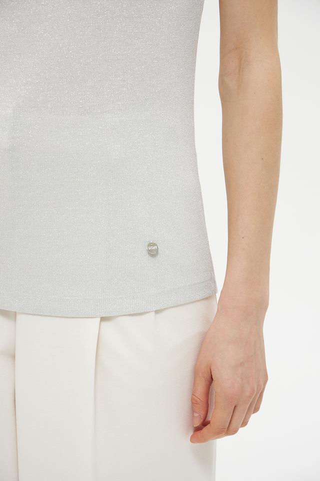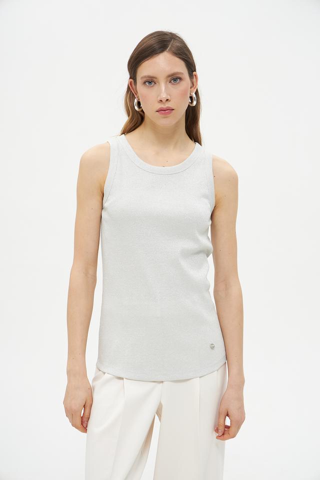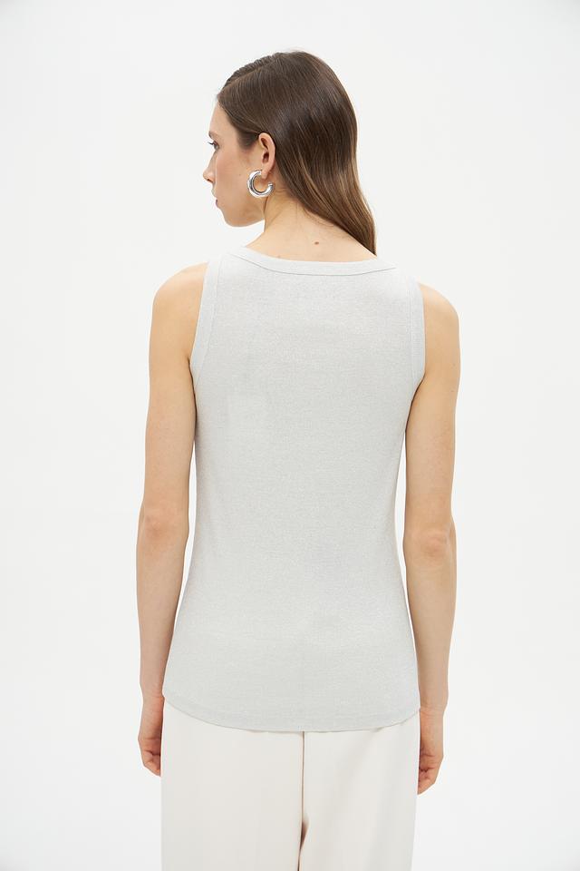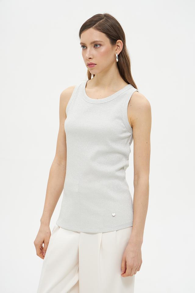 Серый топ Lecomte из вискозы с добавлением металлизированной нити. Модель без рукавов с округлым вырезом горловины. Состав: 78% вискоза, 18% метализ.нить, 4% эластан. Состав: вискоза 78%, метализ.нить 18%, эластан 4%