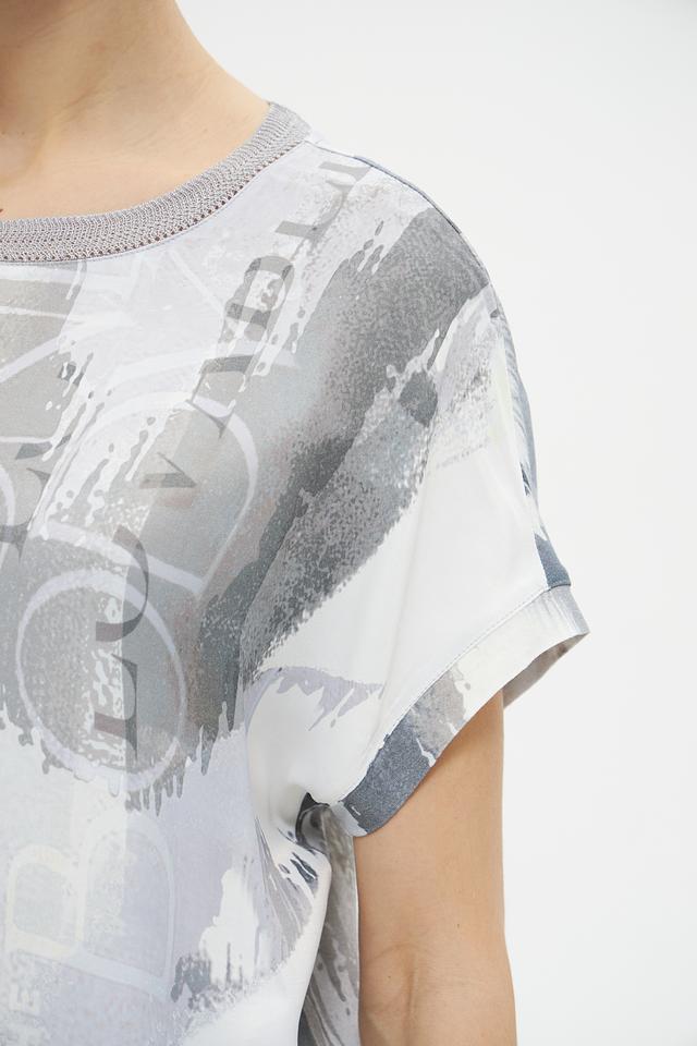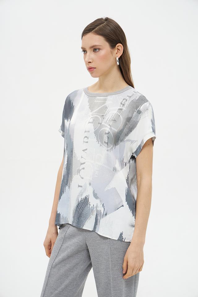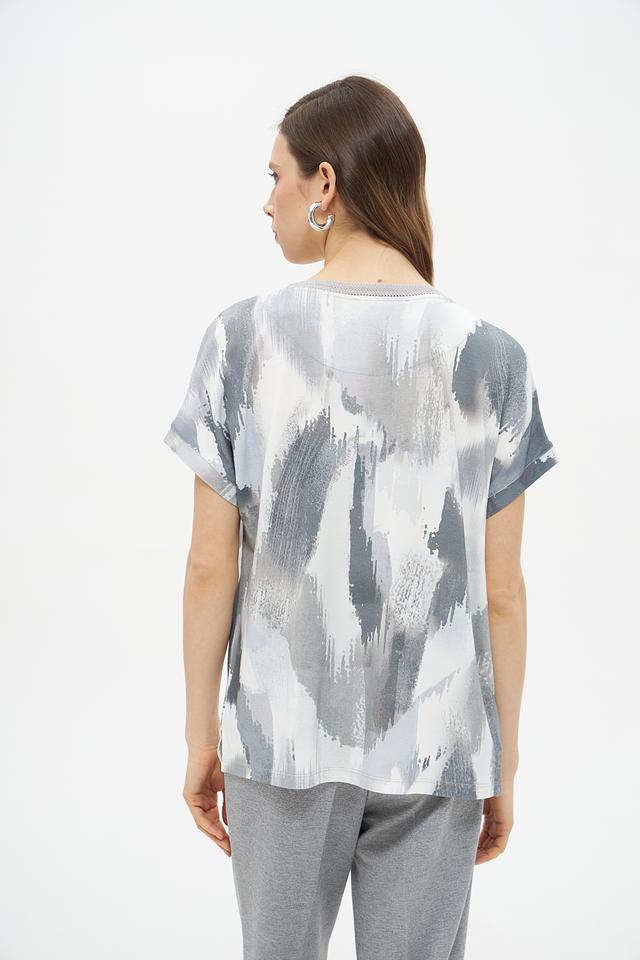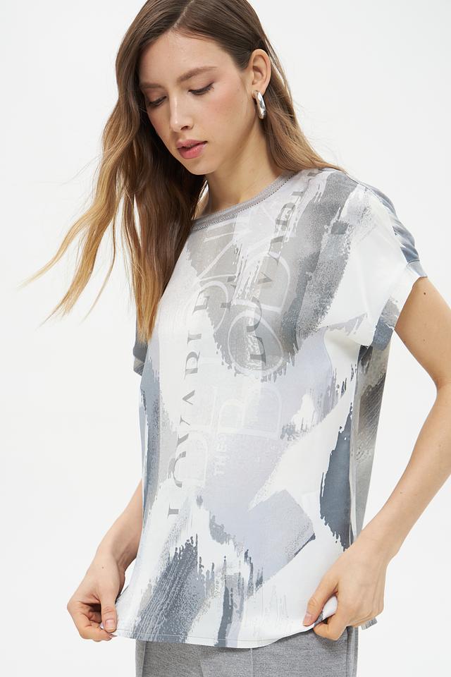 Блуза имеет свободный крой, который не сковывает движений, и короткие рукава, идеально подходящие для теплой погоды. Главной особенностью модели является яркий абстрактный принт в серых тонах, который добавит образу оригинальности и неповторимости.