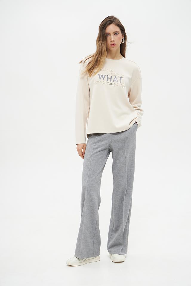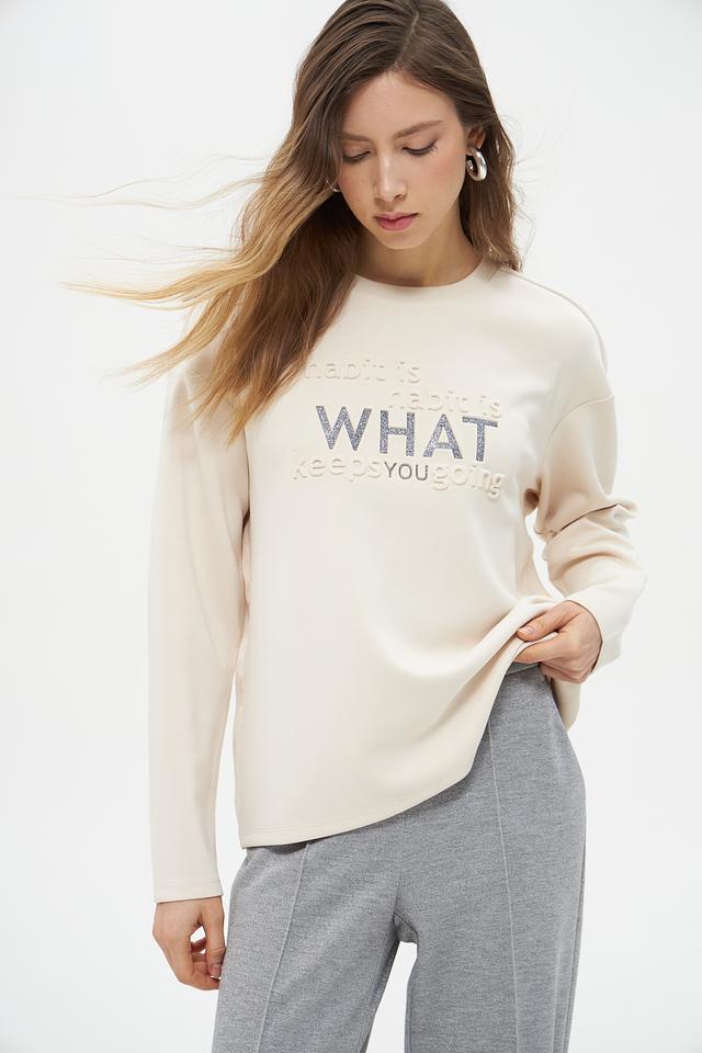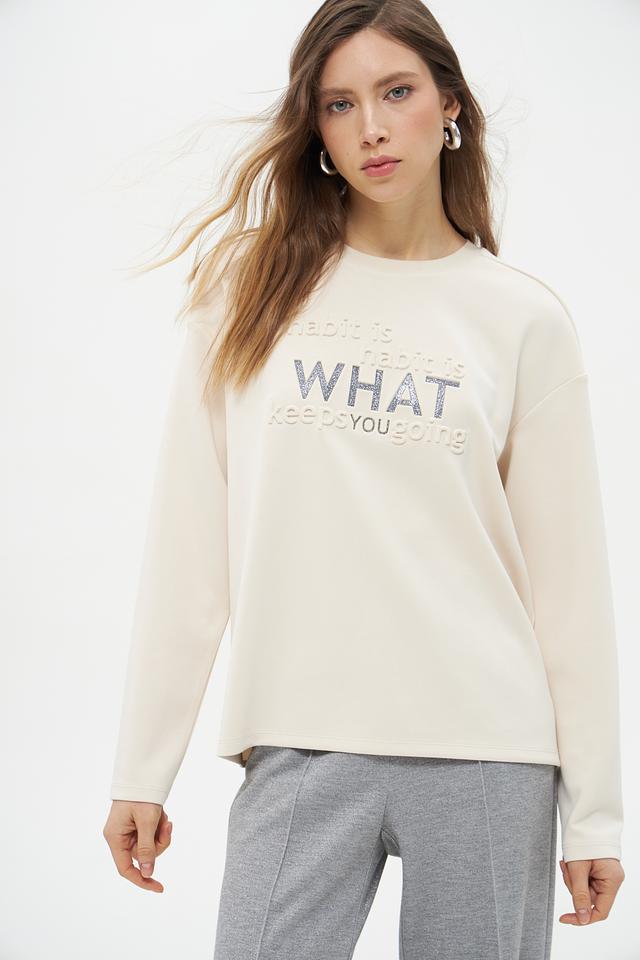 Модель имеет свободный крой, который обеспечивает комфорт и свободу движений. Передняя часть пуловера украшена ярким принтом с надписью, добавляющим образу индивидуальность.