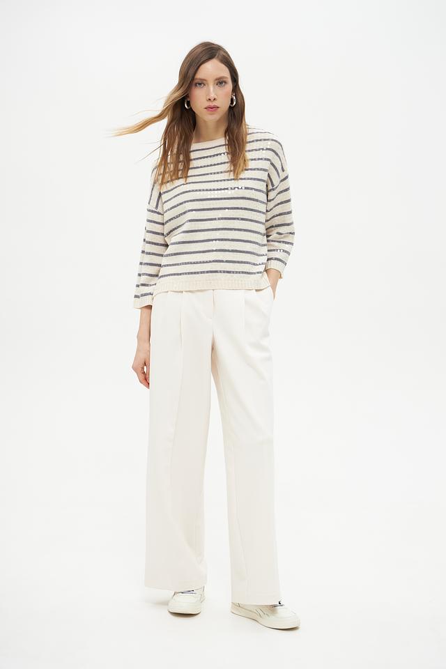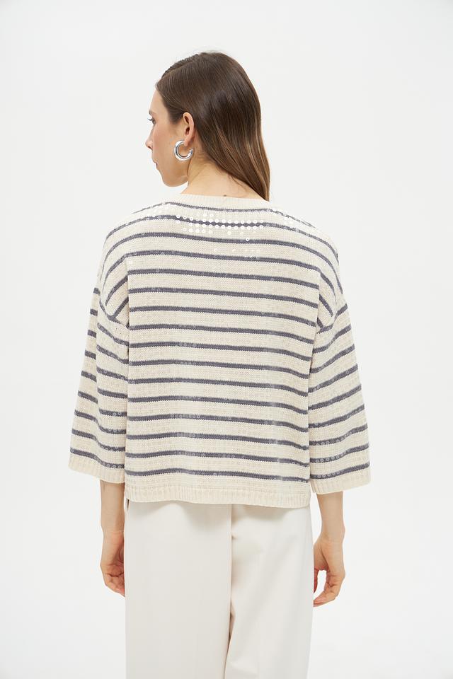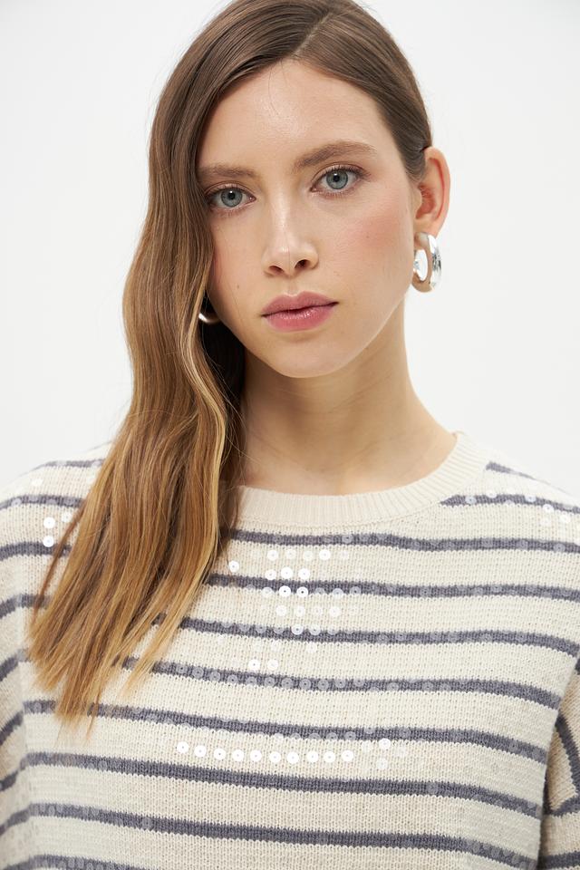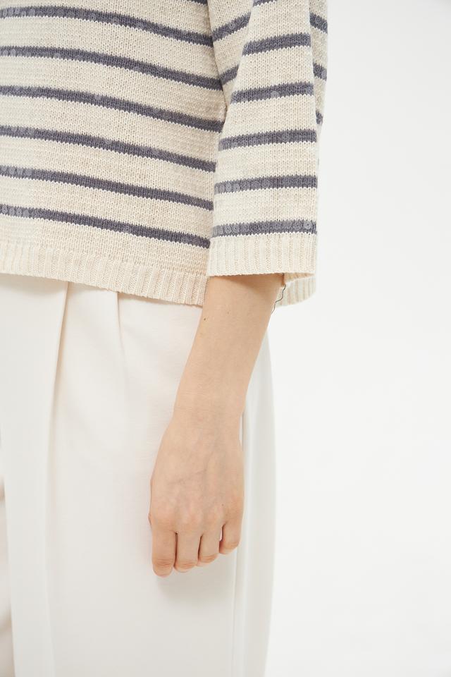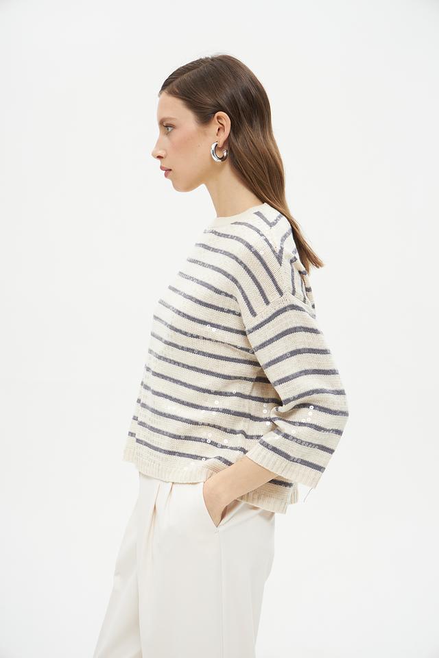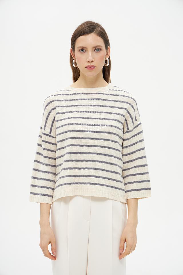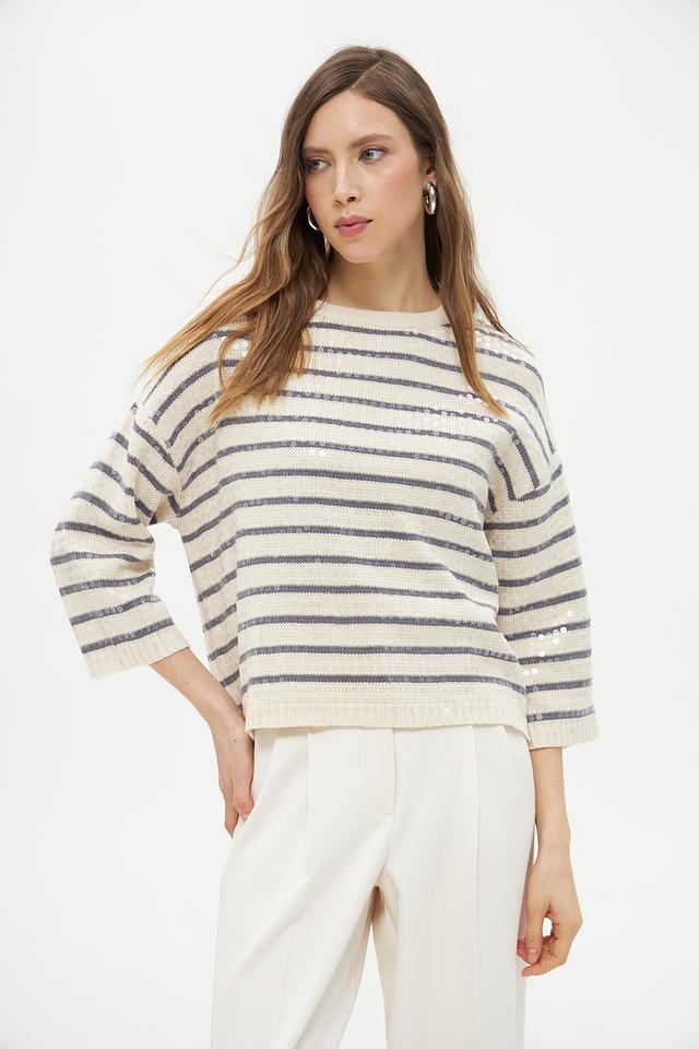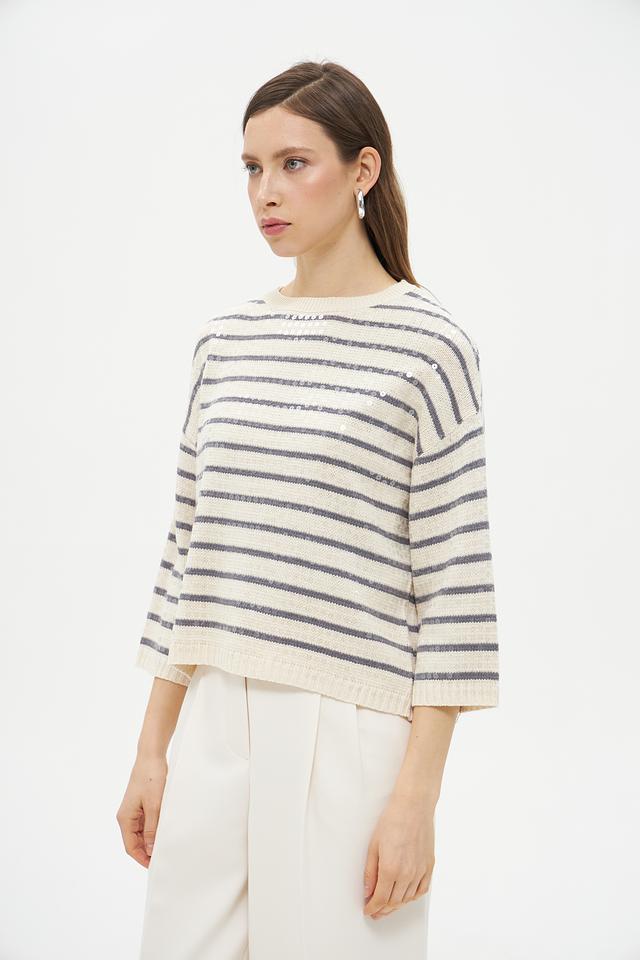 Пуловер имеет классический крой с округлым вырезом горловины и рукавами три четверти. Его отличает яркий дизайн в горизонтальную полоску, сочетающий в себе бежевый и серый цвета. Такая расцветка легко сочетается с различными элементами одежды, позволяя создавать разнообразные образы.