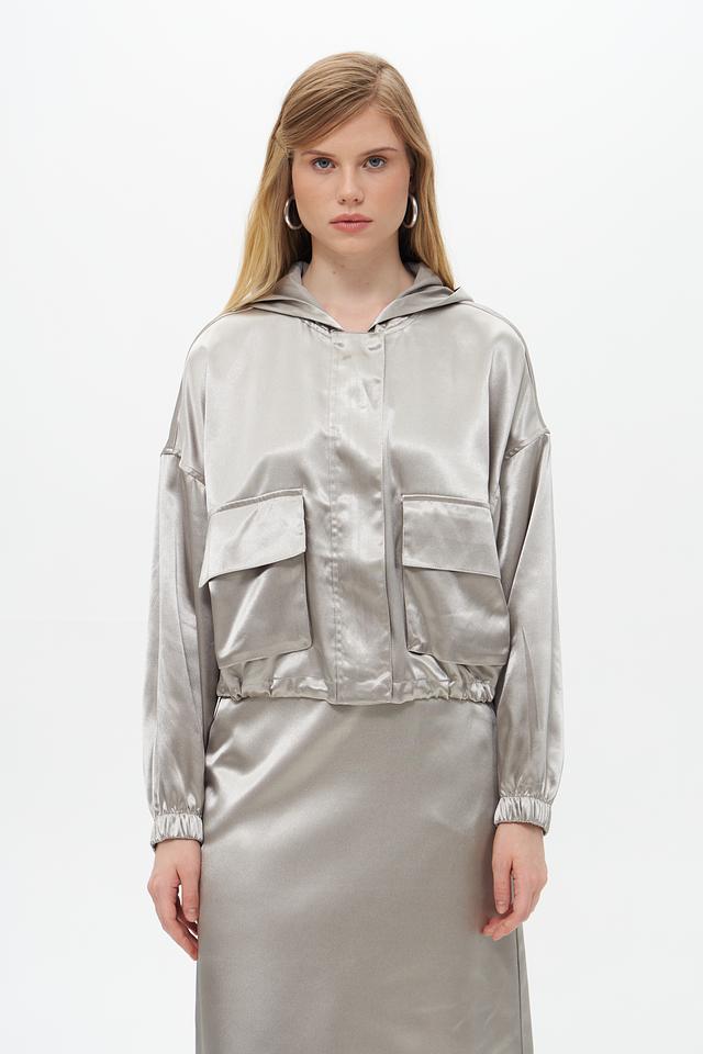 Стильный жакет Lecomte серого цвета выполнен из гладкого атласа. Модель с капюшоном и удобными карманами станет отличным дополнением к вашему образу. Жакет изготовлен из 100% полиэстера. Состав: полиэстер 100%