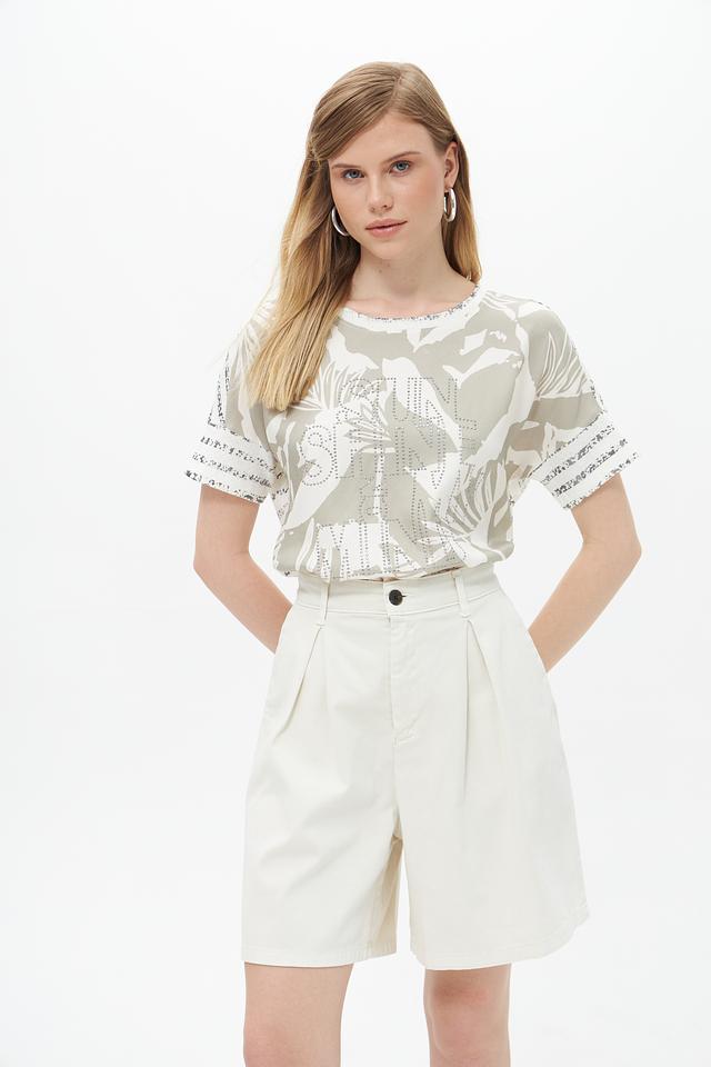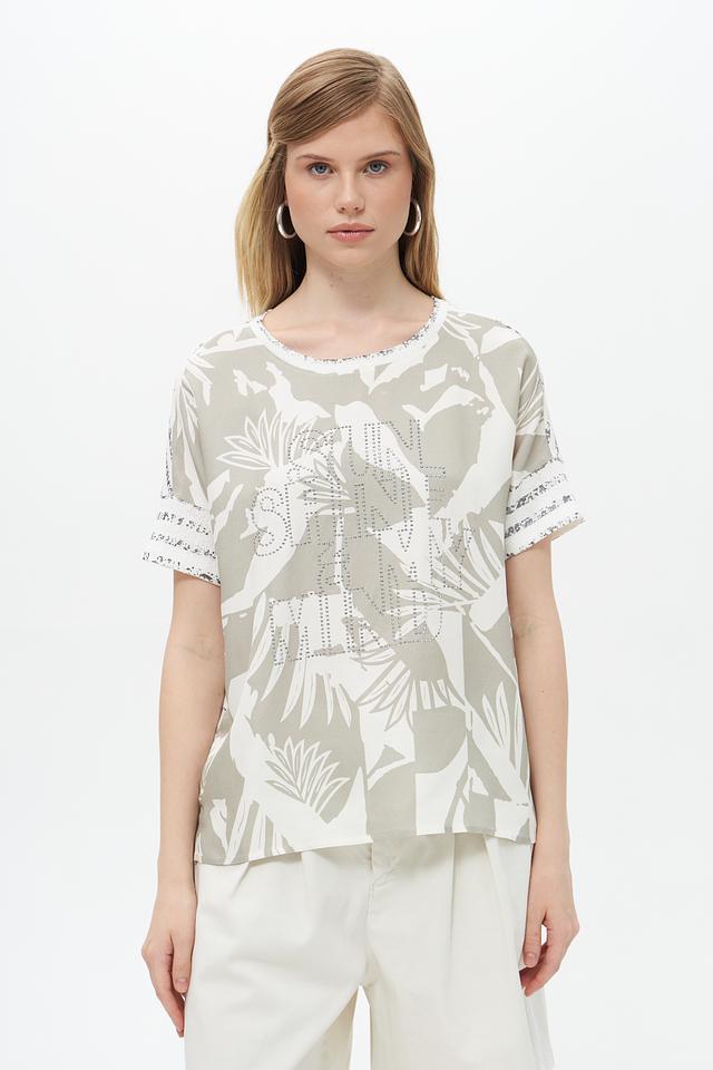 Модель имеет свободный крой, который не сковывает движений и обеспечивает максимальный комфорт. Короткие рукава делают блузу подходящей для тёплой погоды. Круглый вырез горловины лаконично дополняет дизайн.