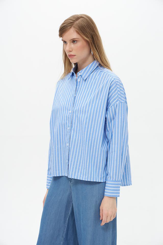 Женская блузка от бренда Lecomte выполнена в светло-голубую полоску. Модель с длинными рукавами 3/4, воротником и застежкой на пуговицы по всей длине.