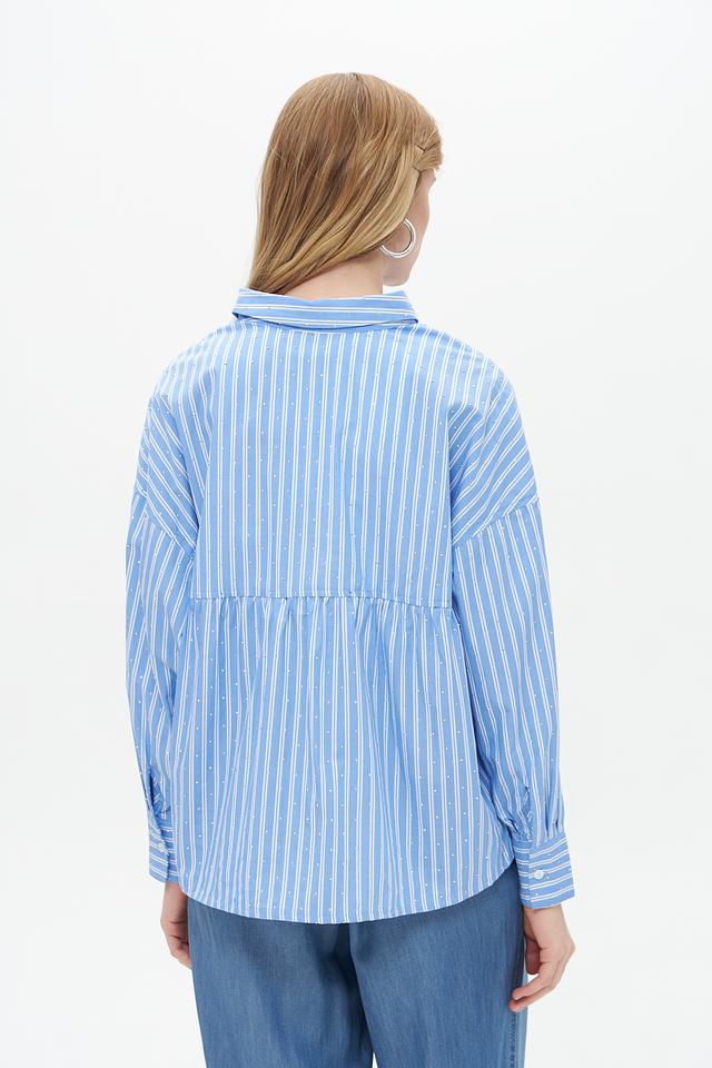 Блузка имеет свободный крой, обеспечивающий комфорт в носке. Дополнительный акцент в виде небольшой сборки на талии придает модели более женственный силуэт.