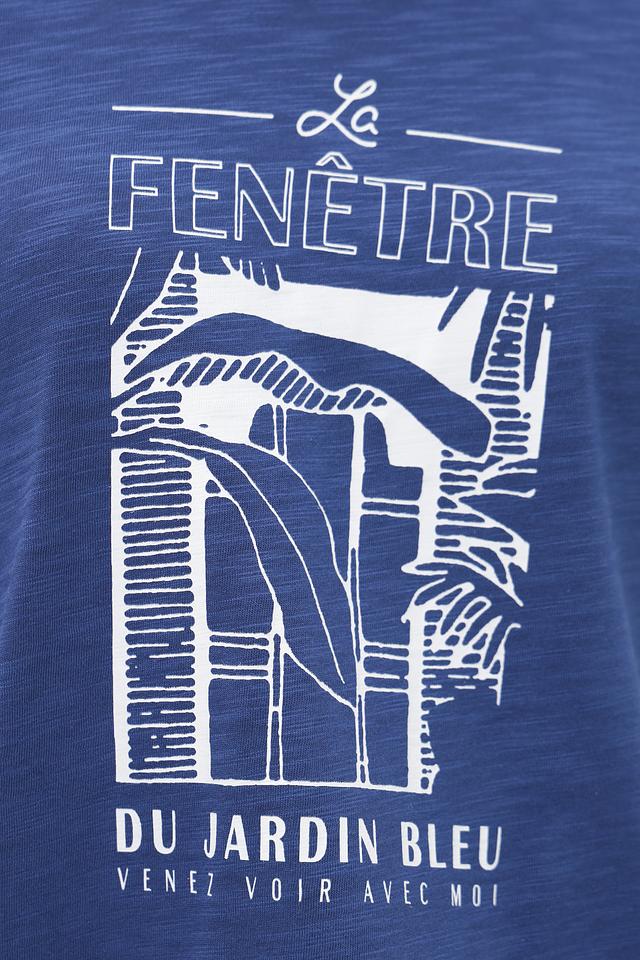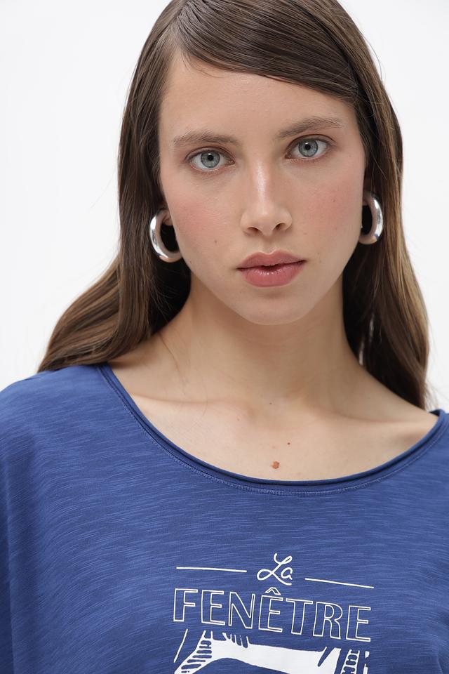 Женская футболка Lecomte синего цвета с графичным принтом. Изготовлена из мягкого хлопка с добавлением модала для комфорта и приятных ощущений. Идеальна для создания повседневных образов. Состав: хлопок 50%, модал 50%