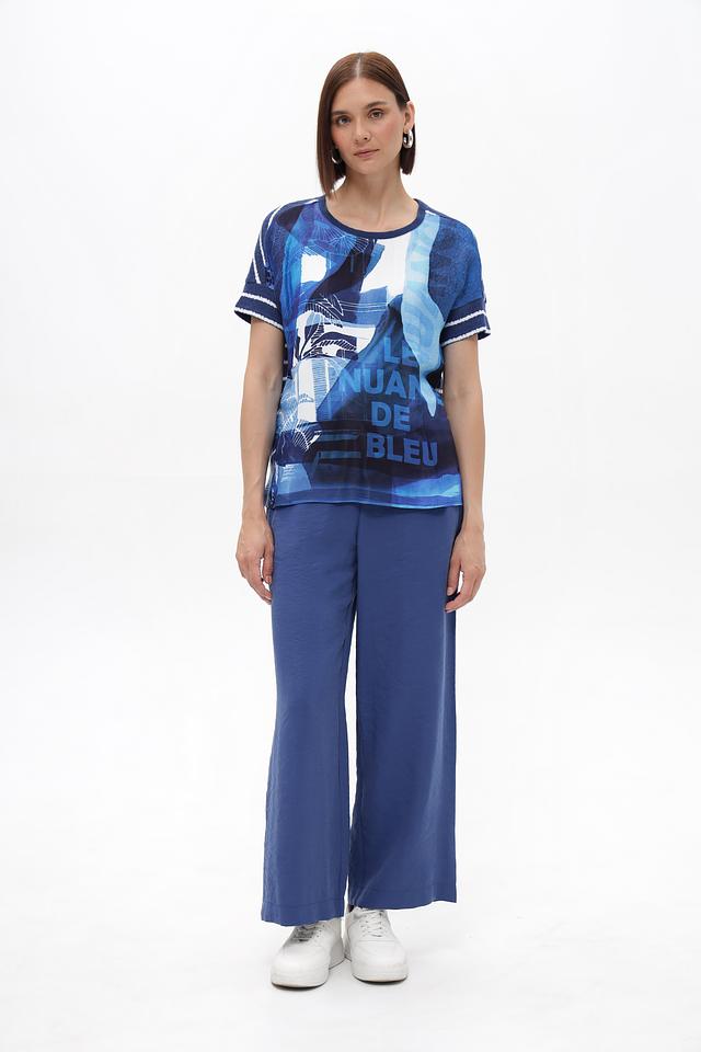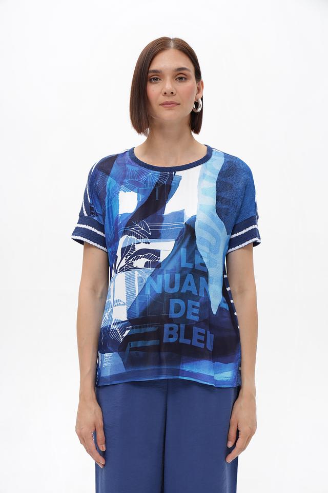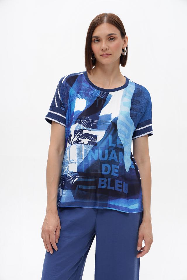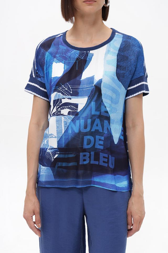 Синяя блузка Lecomte с оригинальным принтом и коротким рукавом. Изготовлена из хлопкового трикотажа с добавлением полиэстера для комфорта и износостойкости. Состав: хлопок 90%, полиэстер 10%