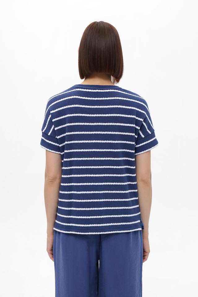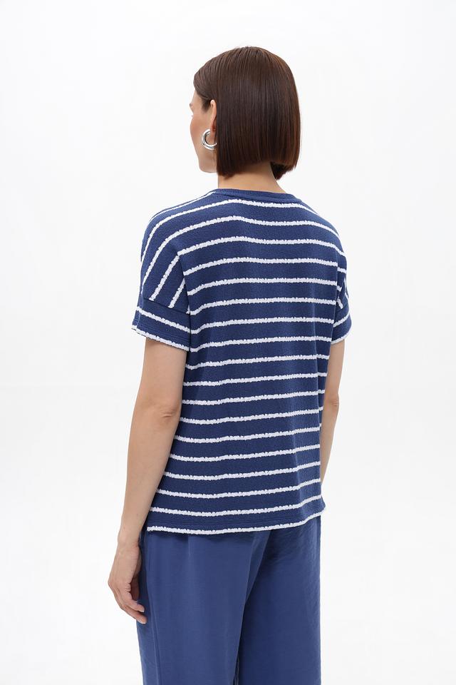Блузка имеет свободный крой, который обеспечивает комфорт в носке, а короткие рукава и круглый вырез горловины придают ей современный вид. Отделка рукавов выполнена в виде белых полосок, добавляющих акцент.