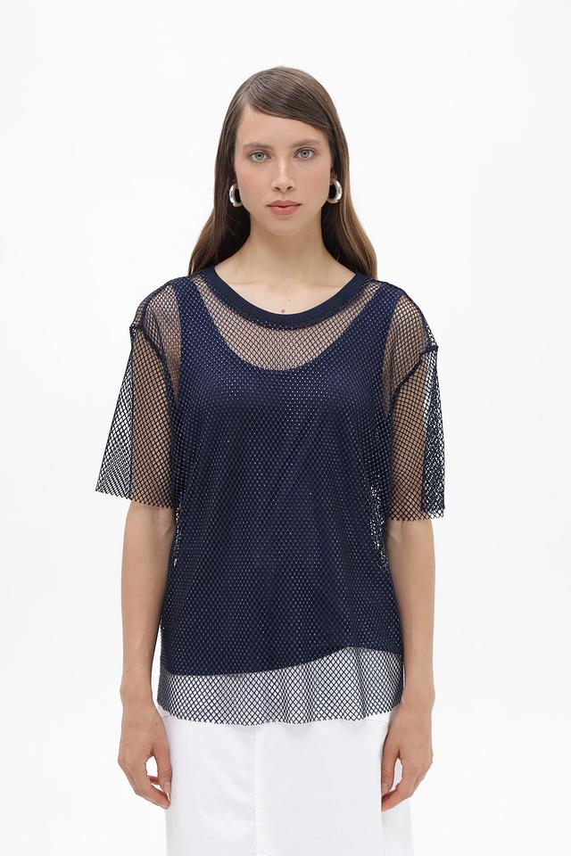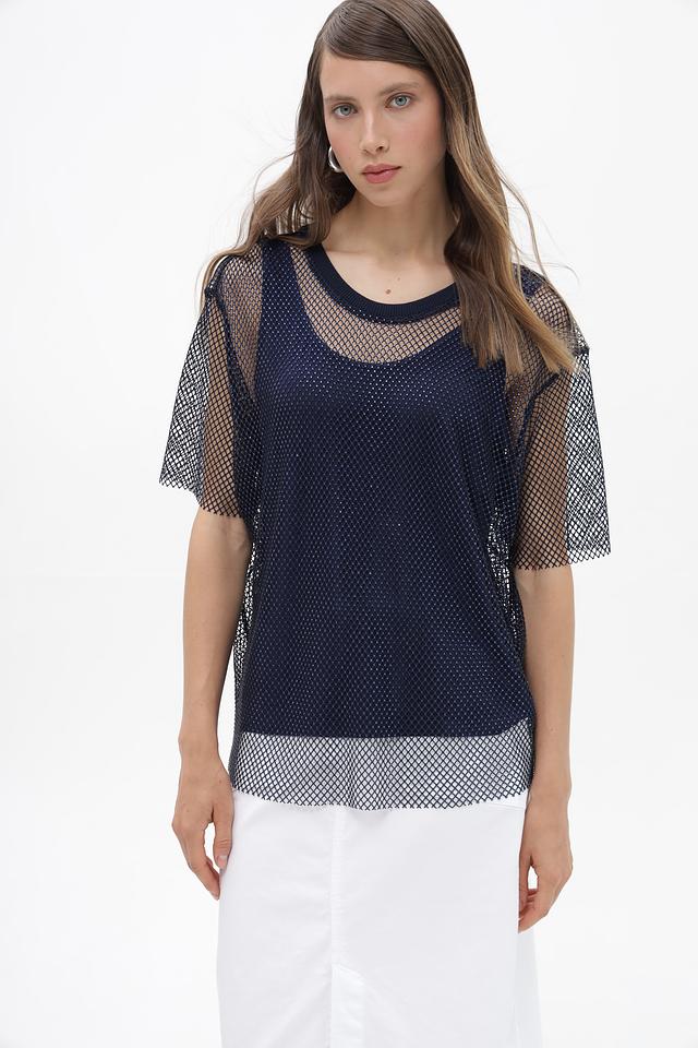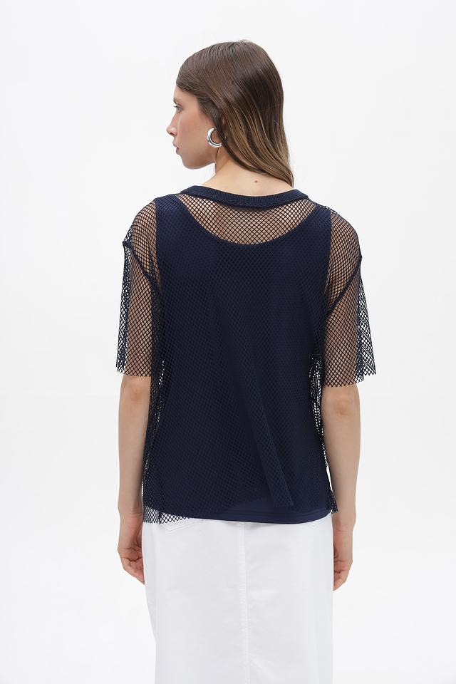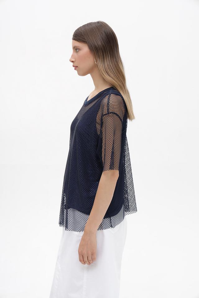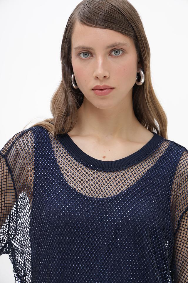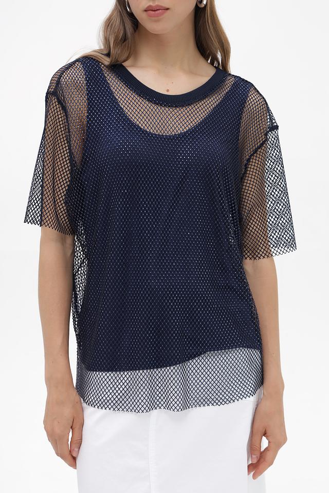 Женская блузка Lecomte темно-синего цвета, выполнена из полупрозрачной сетки с короткими рукавами. Состав: полиэстер с добавлением эластана, обеспечивающим комфорт и эластичность. Состав: полиэстер 95%, эластан 5%