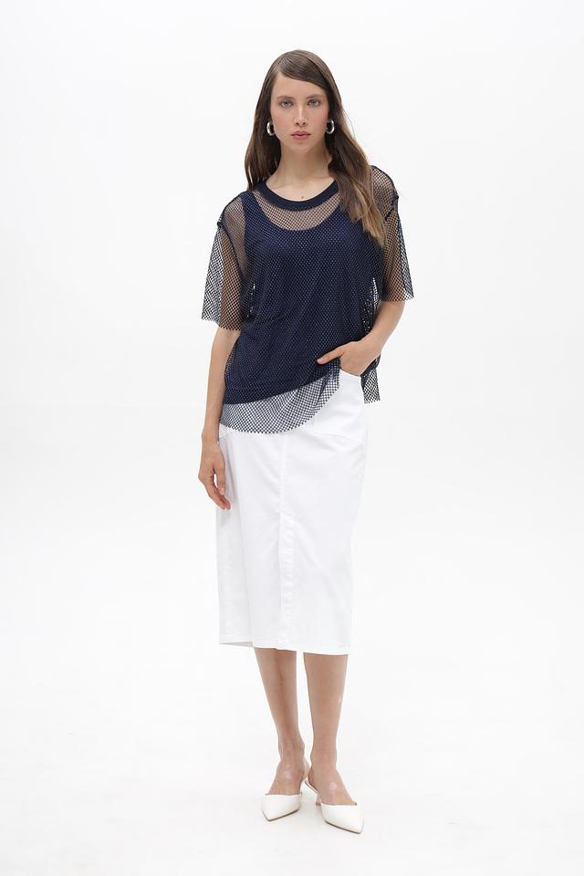 Женская блузка от Lecomte выполнена из легкой и дышащей сетки темно-синего цвета. Модель имеет короткий рукав и круглый вырез горловины, что делает ее универсальной для создания различных образов.