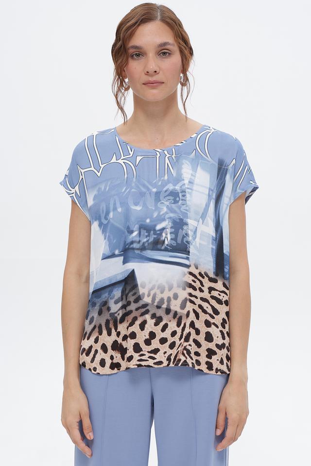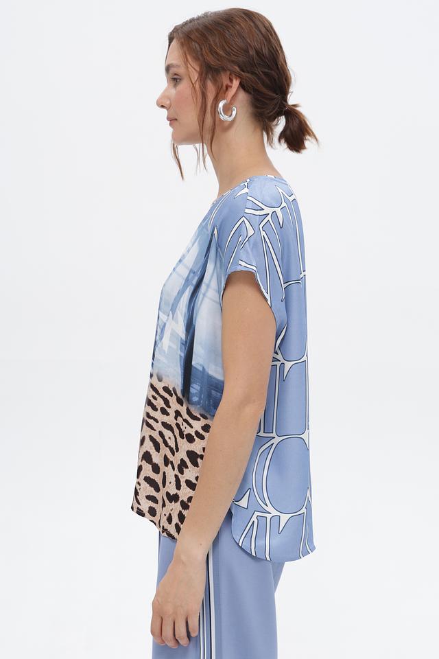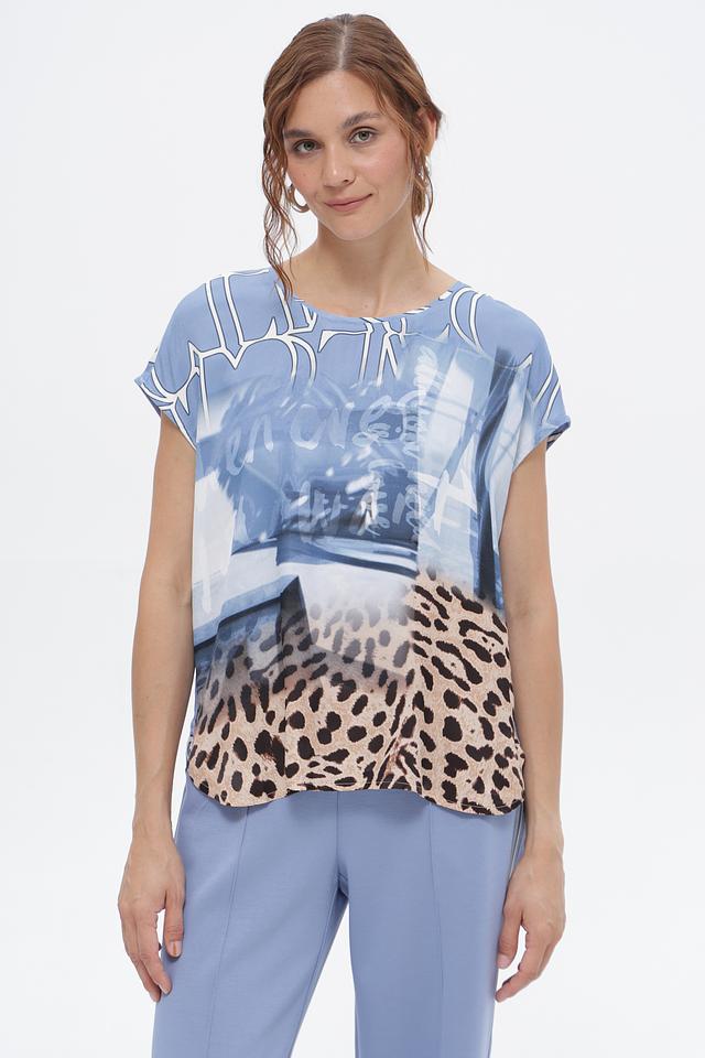Блуза имеет свободный крой, который не сковывает движений и позволяет создать расслабленный образ. Особенностью модели является яркий принт, сочетающий в себе абстрактные элементы и леопардовый узор в голубой и бежевой гамме.