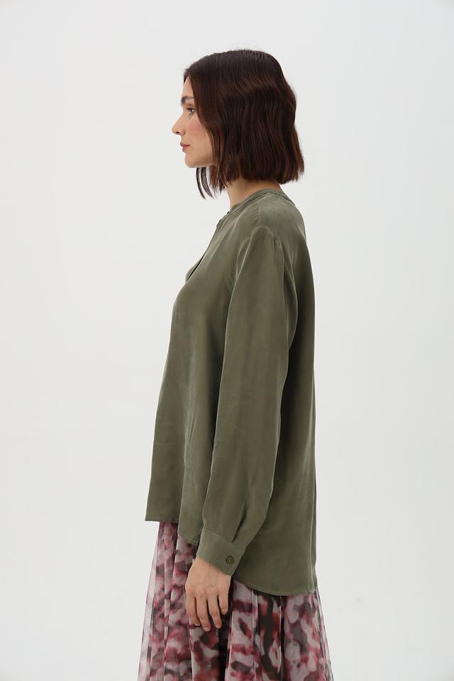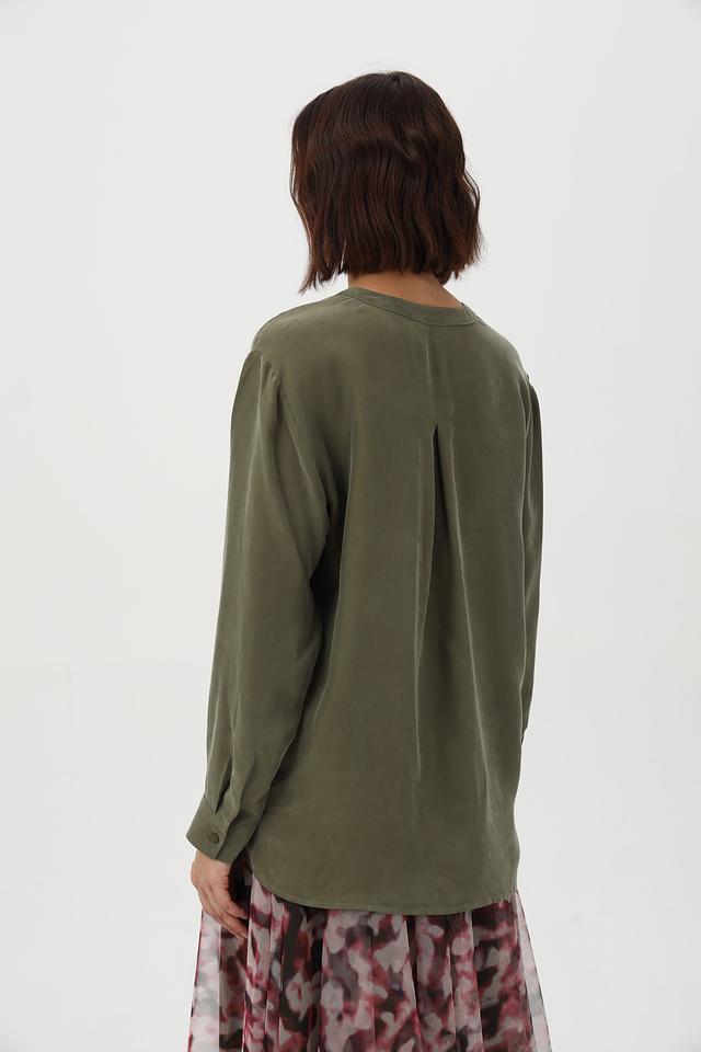 Оливковая блузка Lecomte из вискозы и купро с V-образным вырезом и длинными рукавами. Модель отличается свободным кроем и лёгкой текстурой. Состав: купро 60%, вискоза 40%