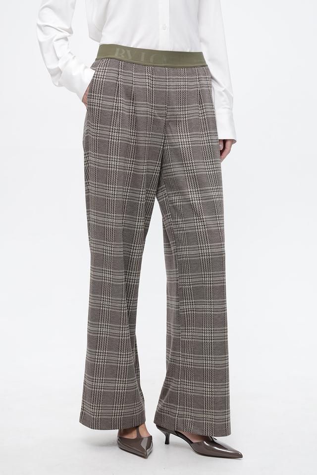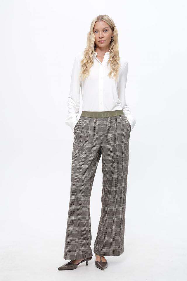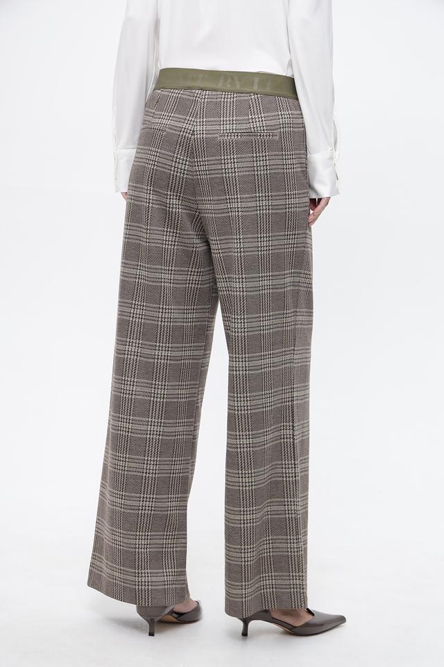Брюки имеют пояс с логотипом бренда, выполненный в приглушенном зелёном цвете, что добавляет образу оригинальности.