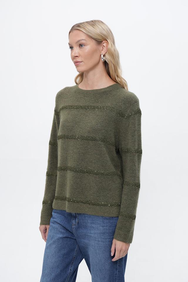 Оливковый цвет пуловера придает ему универсальность, позволяя легко сочетать его с различными элементами гардероба. Декоративные полосы из пайеток добавляют изделию изысканности и привлекают внимание.