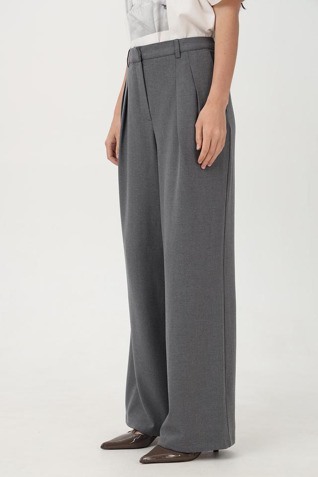 Брюки имеют высокую посадку и клёш от бедра, что визуально удлиняет ноги и создает женственный силуэт. На поясе расположены защипы, придающие брюкам более аккуратный вид. Застежка-молния обеспечивает надежную фиксацию.