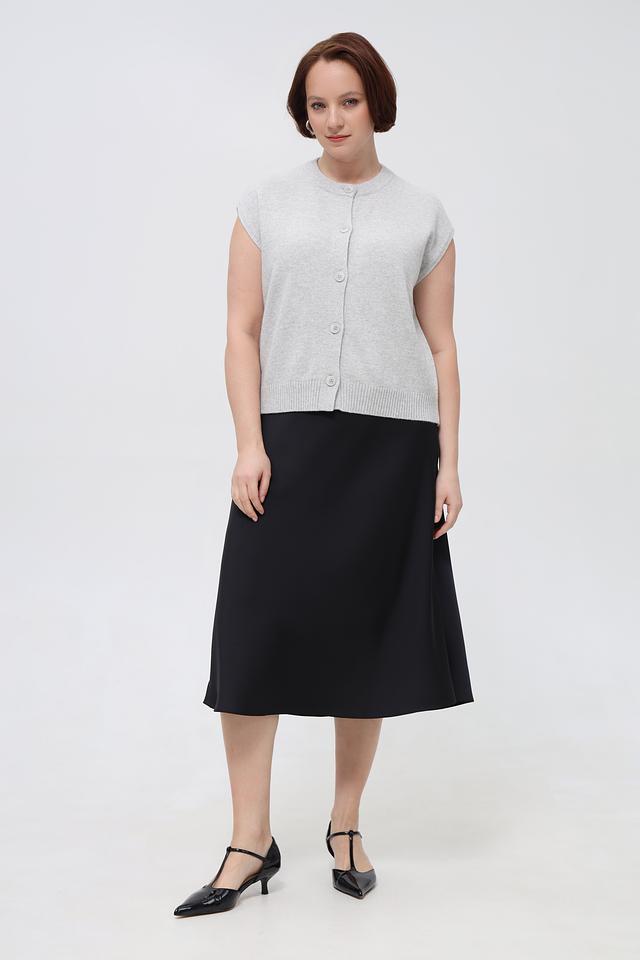 Жилет имеет прямой силуэт и круглый вырез горловины, что обеспечивает комфортную посадку по фигуре. Застежка на пуговицы по всей длине позволяет регулировать степень прилегания и создавать разные образы.