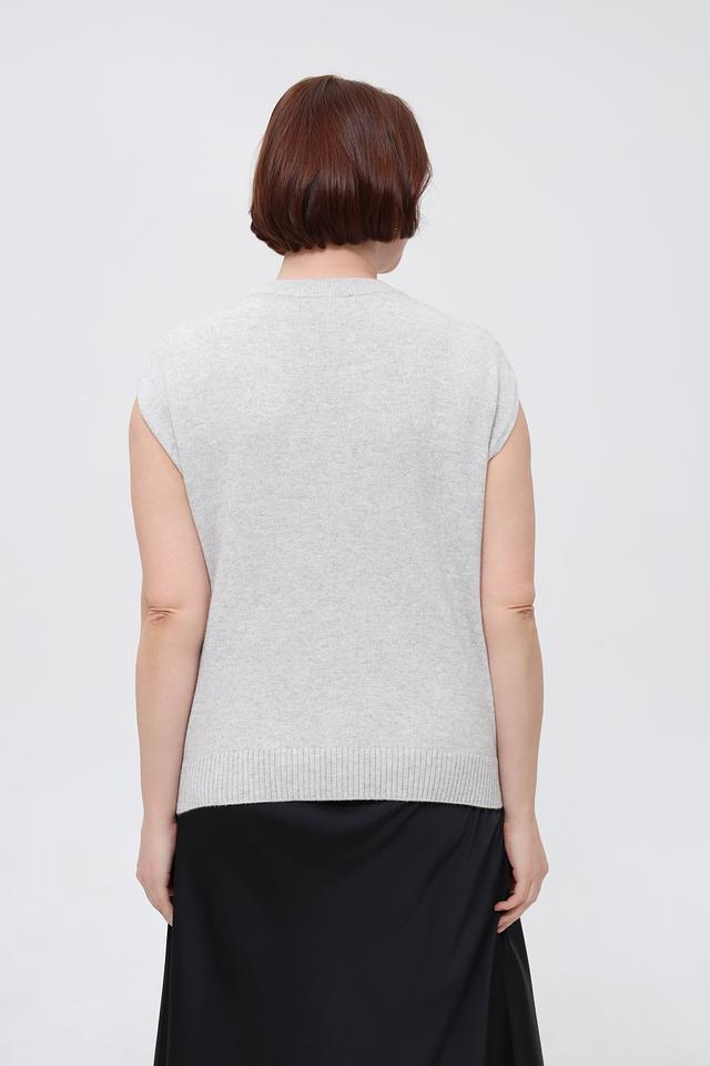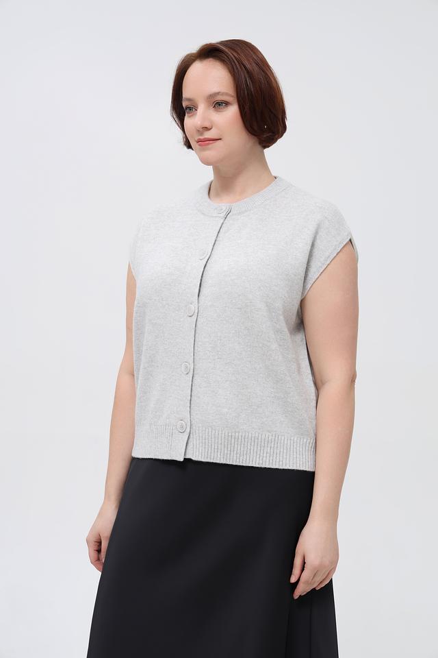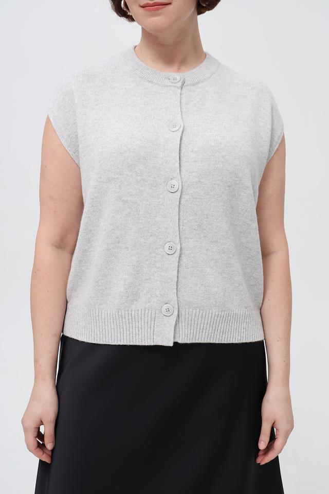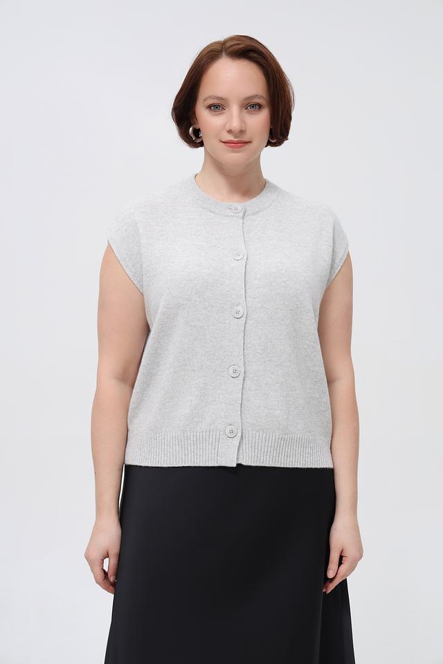 Серый женский жилет Lecomte из смесового трикотажа с застежкой на пуговицы. Изделие имеет прямой крой и круглый вырез горловины. Состав: шерсть, полиамид, модал. Состав: шерсть 50%, полиамид 30%, модал 20%
