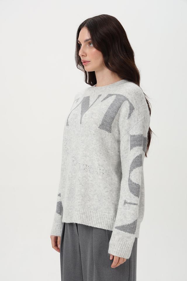 Пуловер имеет свободный крой, длинные рукава и классический вырез горловины. Особый акцент сделан на крупную надпись, выполненную с использованием пайеток, что придает изделию изысканность и оригинальность.