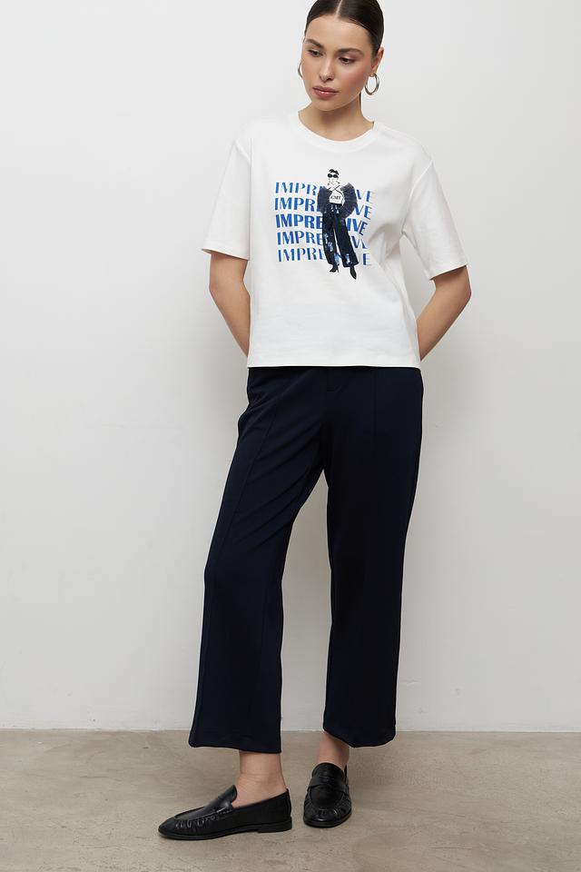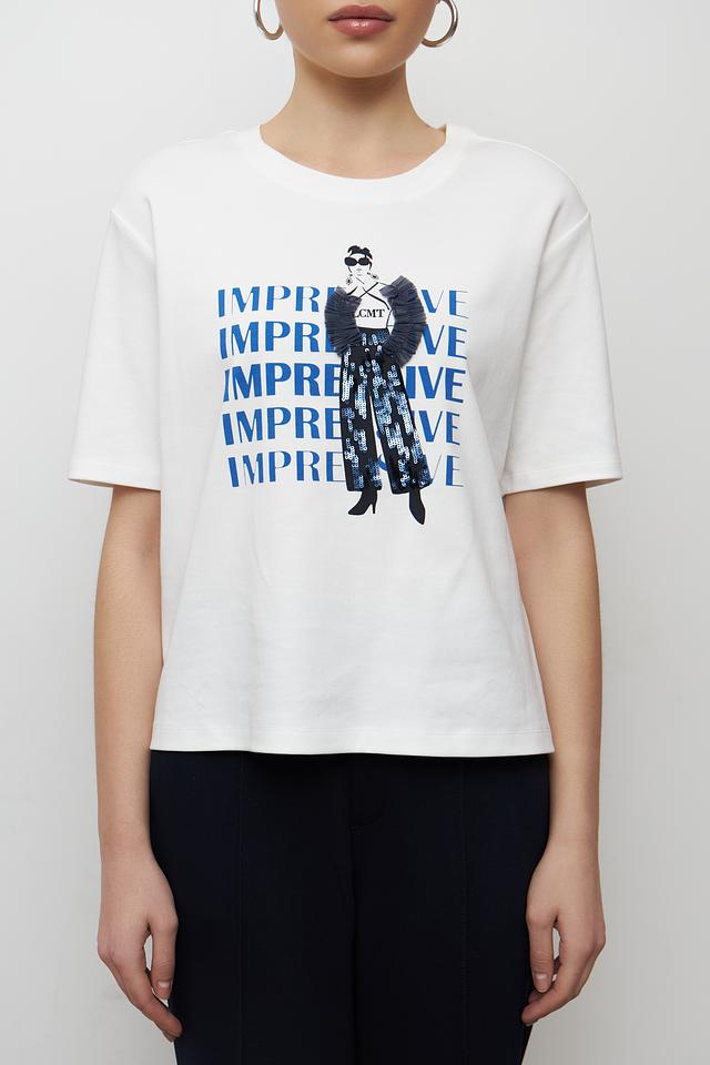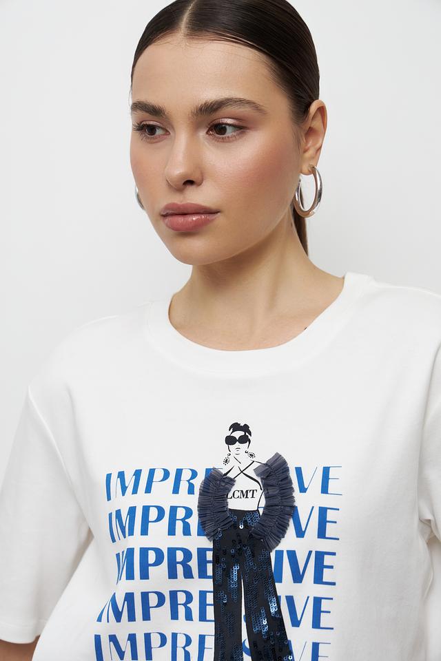 Особенностью данной модели является яркий принт с изображением девушки в стильной одежде и надписью "IMPREVE". Принт выполнен в синих тонах, что создает контрастный и запоминающийся образ.