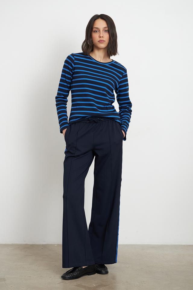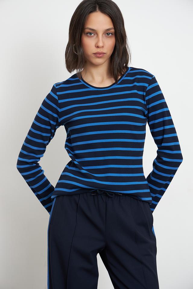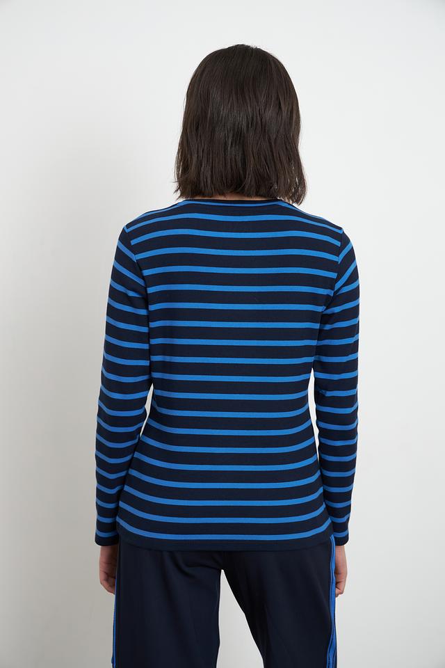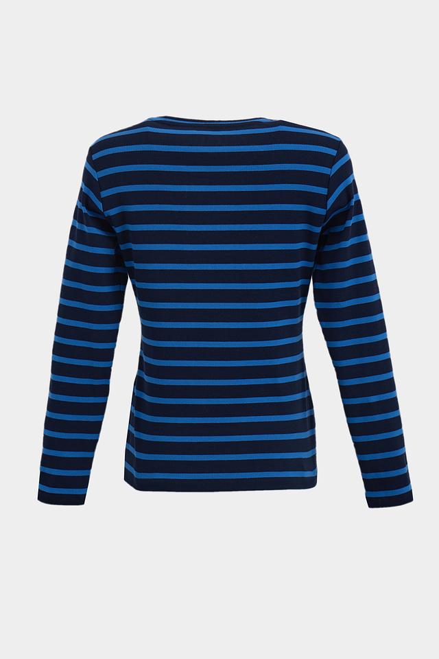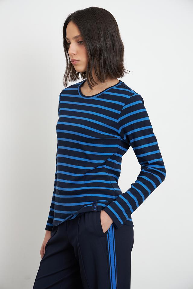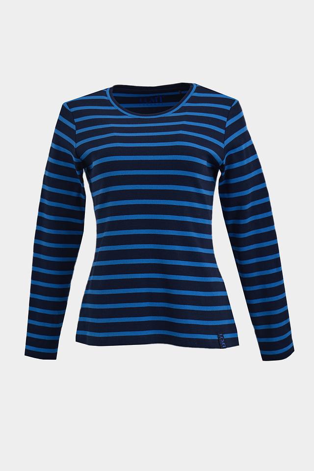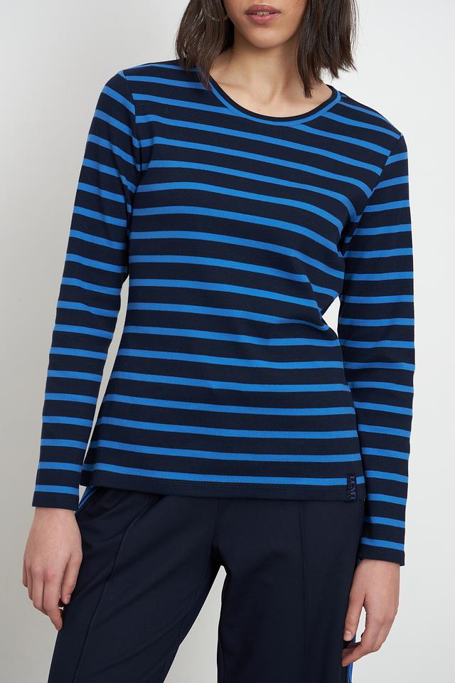 Женская футболка Lecomte синего цвета с классическим полосатым дизайном. Изготовлена из мягкого хлопка с добавлением эластана для комфорта и хорошей посадки. Идеально подходит для повседневного образа. Состав: хлопок 95%, эластан 5%