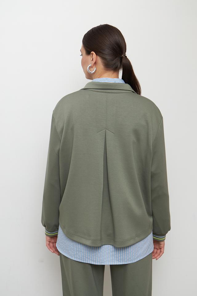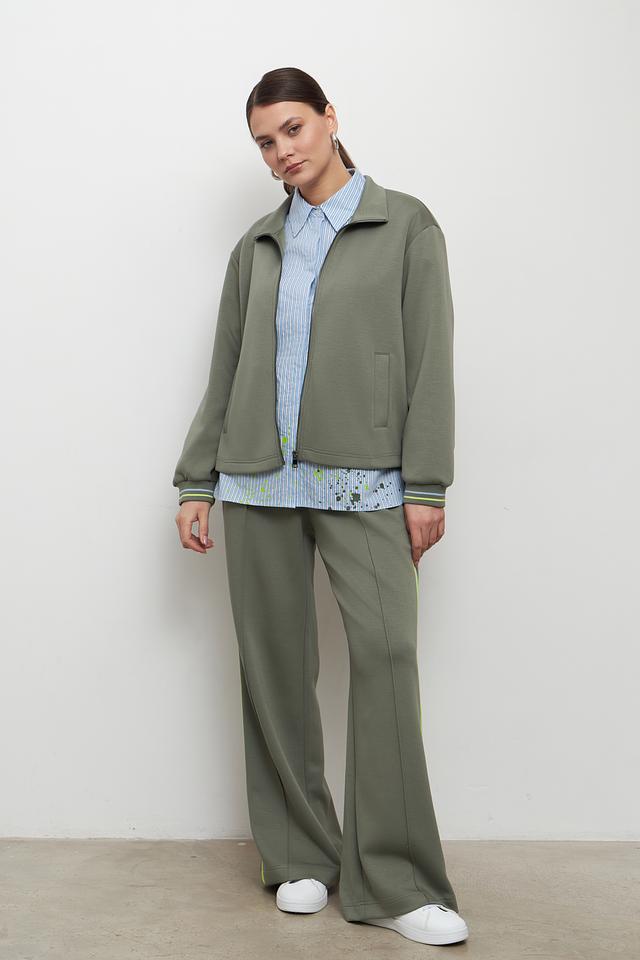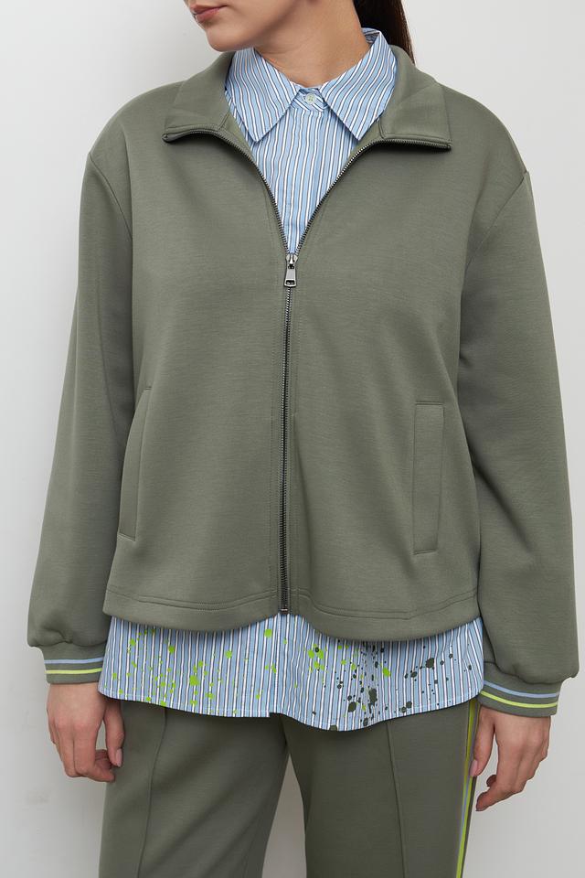 Жакет имеет удобную застежку-молнию, боковые карманы и манжеты с эластичной лентой, отделанной контрастной полосой. Спинка жакета дополнена небольшими складками, что придает ему более интересный вид.