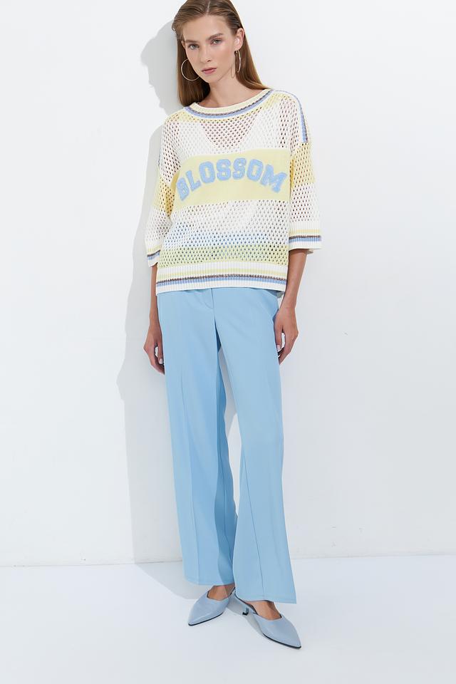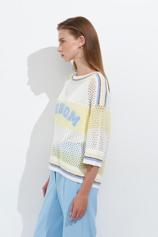 Особый акцент в дизайне пуловера – вышивка "Blossom" светло-голубым цветом, которая придает ему оригинальность и индивидуальность. Сочетание белого, светло-жёлтого и голубого цветов создает свежий и яркий образ.
