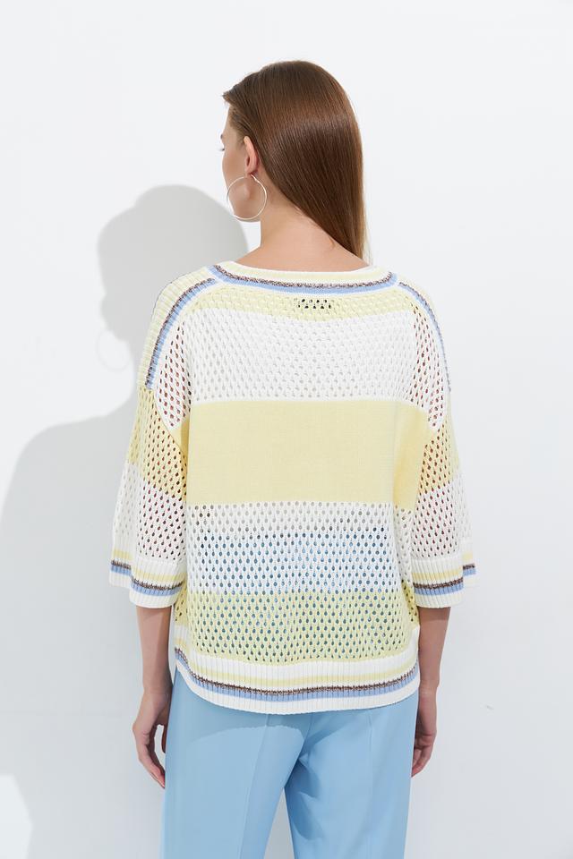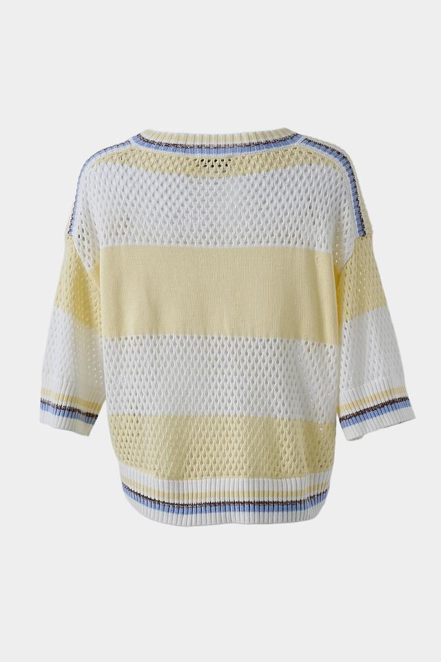 Женский пуловер Lecomte светло-жёлтого цвета с надписью "Blossom" выполнен из хлопкового трикотажа с ажурной вязкой. Модель имеет свободный крой и короткие рукава, идеально подходит для создания лёгкого летнего образа. Состав: хлопок 100%